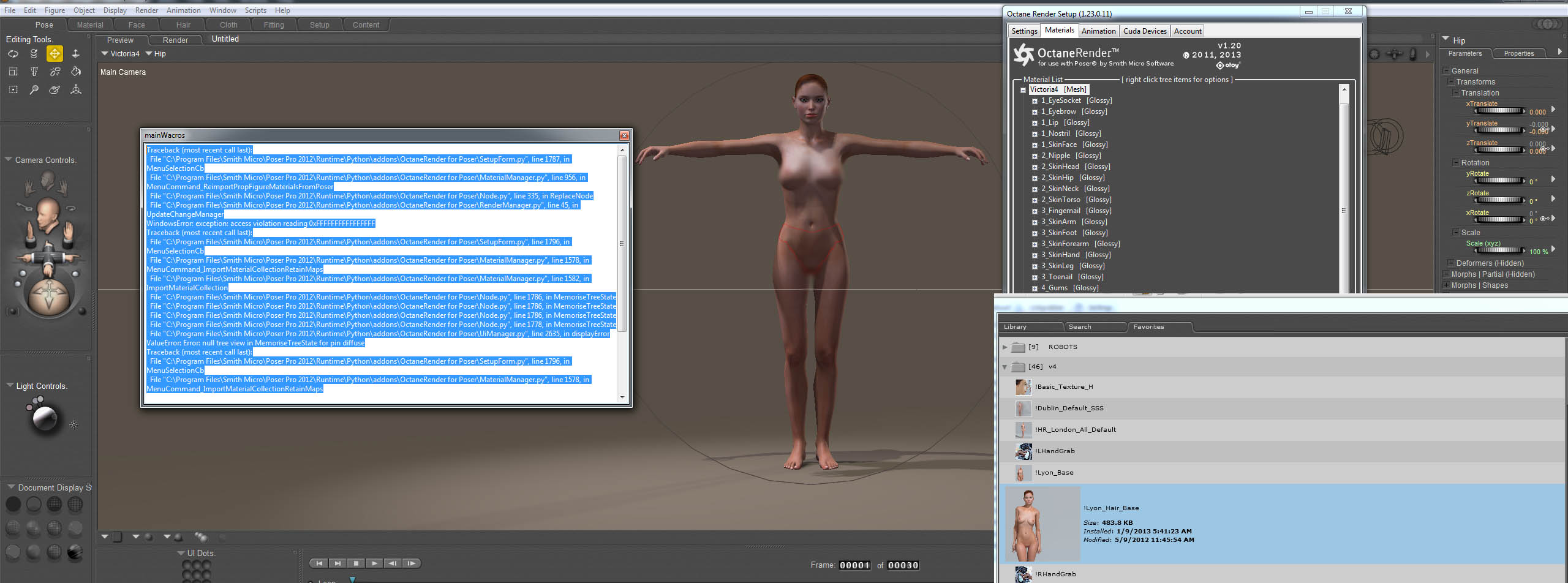 File "C:\Program Files\Smith Micro\Poser Pro 2012\Runtime\Python\addons\OctaneRender for Poser\MaterialManager.py", line 956, in MenuCommand_ReimportPropFigureMaterialsFromPoser