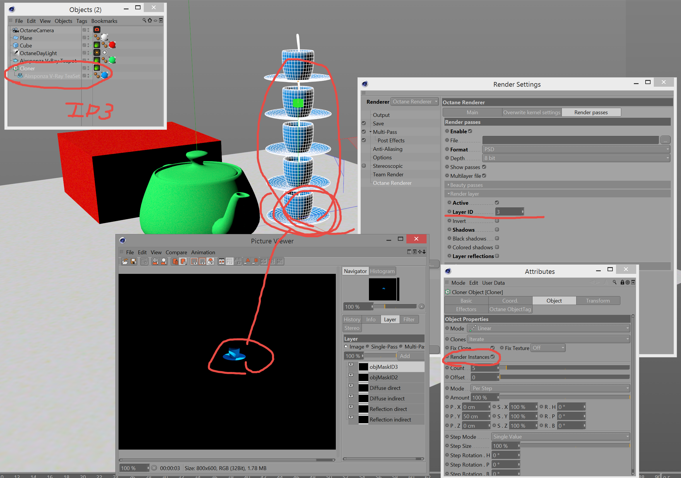 Render Setting : Set ID Layer 1 : Both Teapot Rendered.