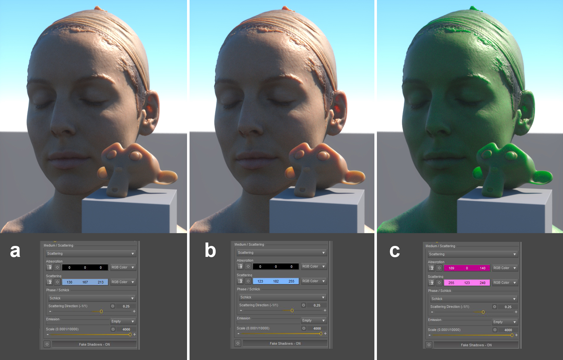 (c) is pushing it to an extreme. By pushing the Red slider all the way up in the Scattering RGB color, we're blocking red light from scattering, and the scattering color becomes green. I adjusted the absorption slider here too, because it wasn't looking right in this render with Absorption at 0-0-0. The Absorption slider is a bit voodoo for me. It's hard keeping all of these interacting variables in my head, and understanding what the heck is going on all of the time. I suspect that if I can figure out something more interesting to do with the Absorption slider, it'll open up new possibilities. For now, leaving it at 0-0-0 for rendering skin seems to be ok though. I think there's some interaction going on between Absorption and the Transmission color (basic skin color) that I'm not getting. I'd like to experiment with it more in the future. Let me know if you guys come up with anything!