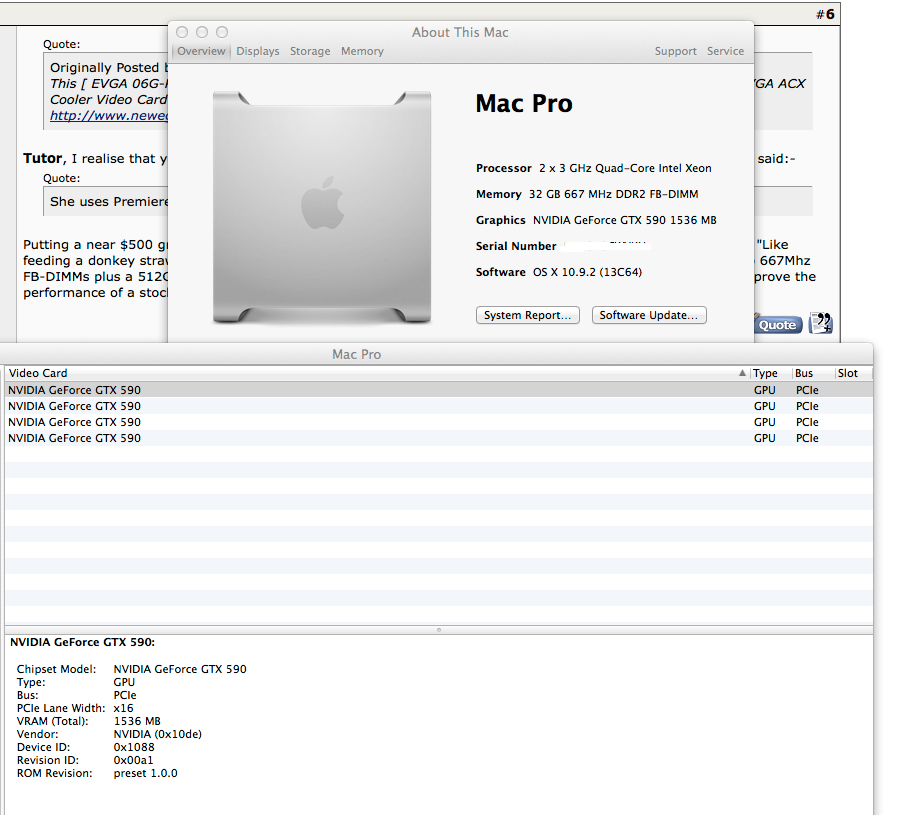 The pic below shows some info about one of my four MacPros (it's the 2007 version) that was then running 2xGTX590s (each dual GPU processor cards); I tried installing one of my GT640s, in addition to the two 590s, and the system wouldn't boot. I tried installing other cards also with the same result. So that why I used the term "GPU processors" instead of "GPU cards" because if the cards are dual GPU processor cards, then the limit is 2. But you can install up to three double wide CUDA cards (single GPU processor version) in a Pre-2013 MacPro's case along as you adequately power it [ http://forums.macrumors.com/showthread. ... st18872245 ]. The saving grace is that as future GPU processors become more powerful, the three double wide CUDA (single GPU processor) card installation limit for inside of the MacPro's case, will not matter as much.