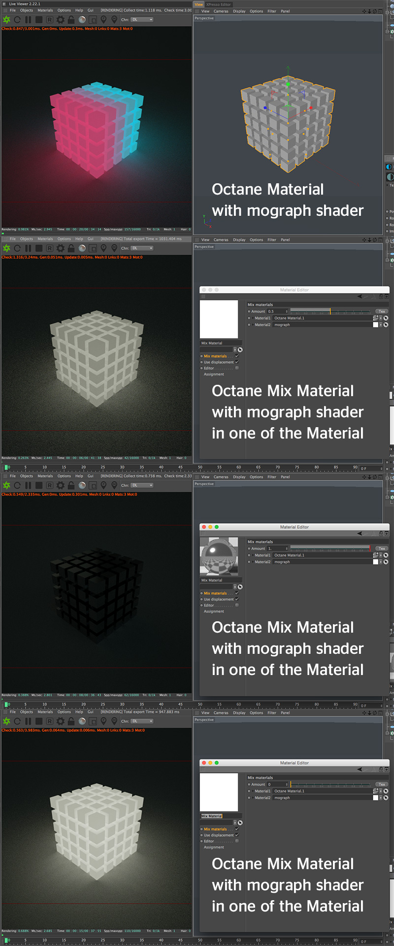 i only have small problem with mograph shader and it is that he is not render with Octane Mix Material i hope i am not doing something wrong and btw the Material with mograph shader is Diffuse and the other is Glossy with out mograph shader
