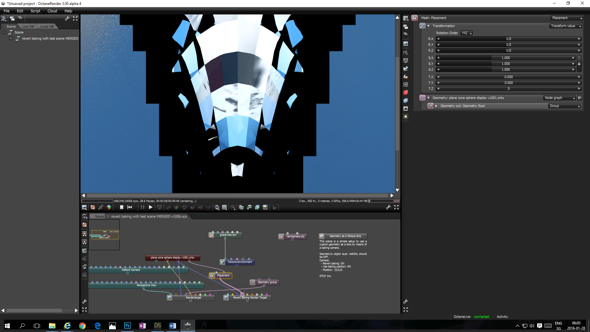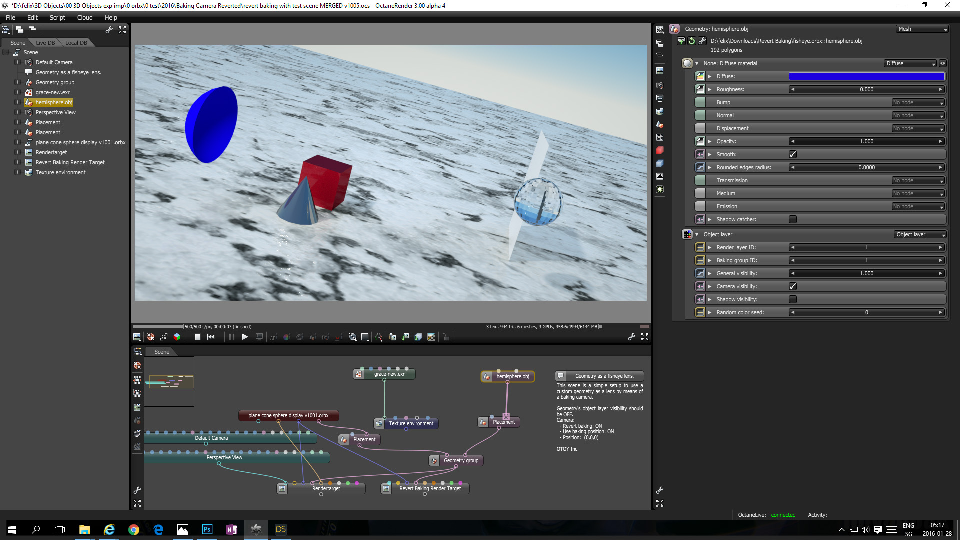 I exported the test scene from OcDS to OR standalone and imported the provided fisheye.orbx to the scene as well.