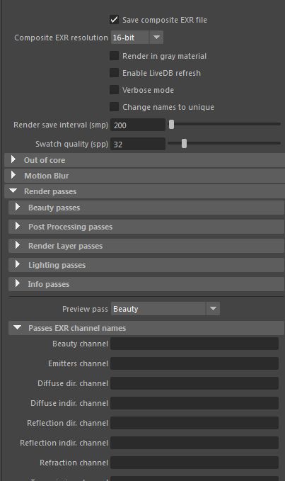16-bit half float option is missing. 32bit is in most cases total overkill. 1080p frames in 32bit with multiple passes (beauty around 32mb) kills the compositing workflow. For stills 32bit is fine, but for animation 16bit must be an option! It’s possible from the standalone app (not when batch) when “save rendered to image file.” Also add compression to EXR - right, it’s missing? a black frame take up as much space as one filled with colors :/