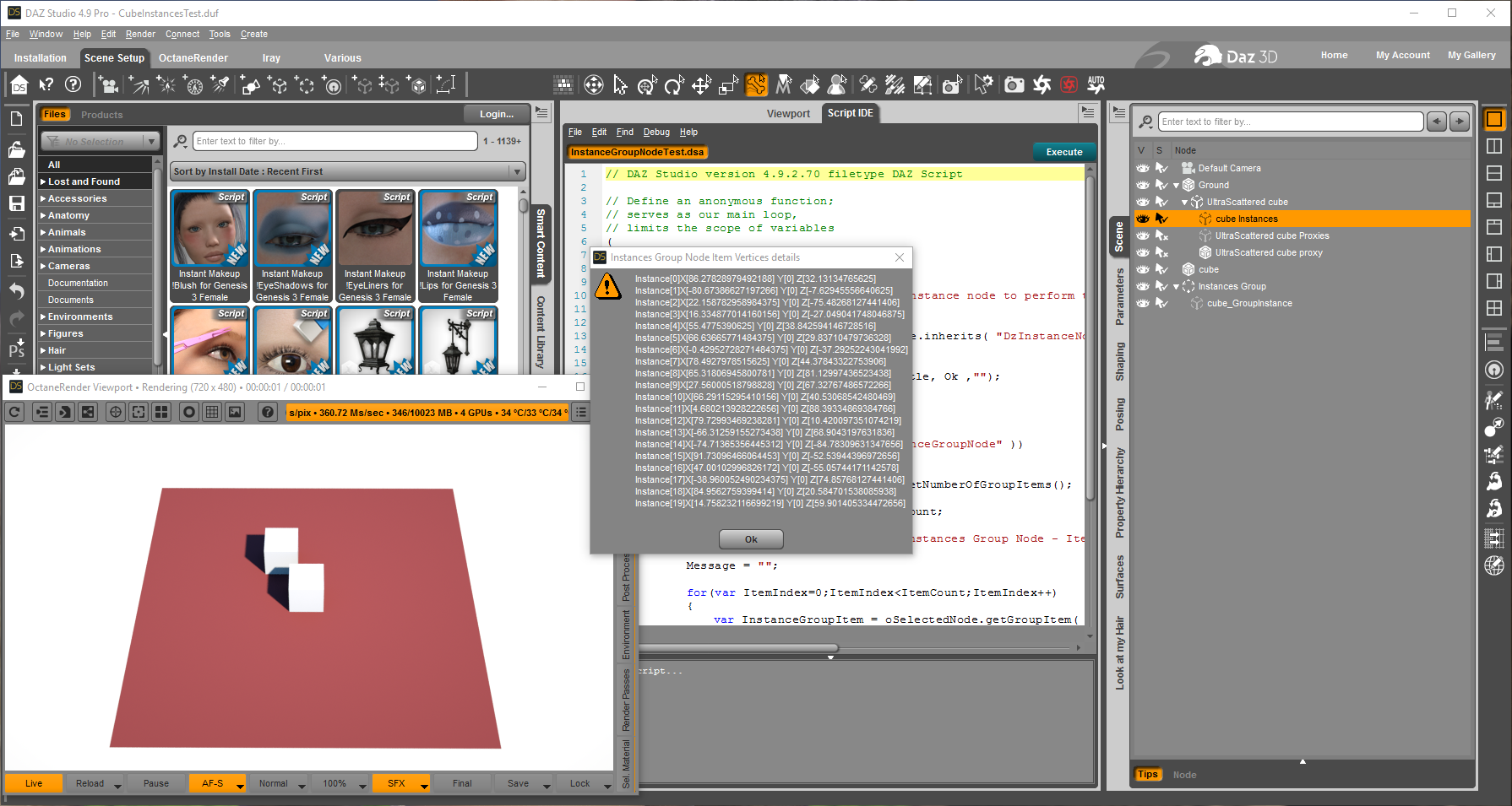 And the the vertices of each instance clearly shows the X value is different like you can see in the screen shot in my previous post. So I am not sure if the Octane plugin is somehow rendering all the instances at the same place or is only reading 1 instance or reading the cube_GroupInstance as the instance and not checking if is of type DzInstanceGroupNode.