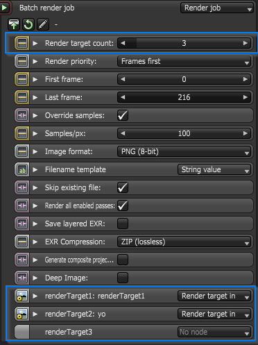 The render job graph is just a Lua script graph sitting on top of the render job graph Lua API, allowing everyone to write his/her own render job implementation. Lua scripts can't create an arbitrary GUI in the node stack editor, but only input linkers, i.e. what you are asking for is currently not possible. What is wrong with the setting the render target count for the batch render job graph anyway?