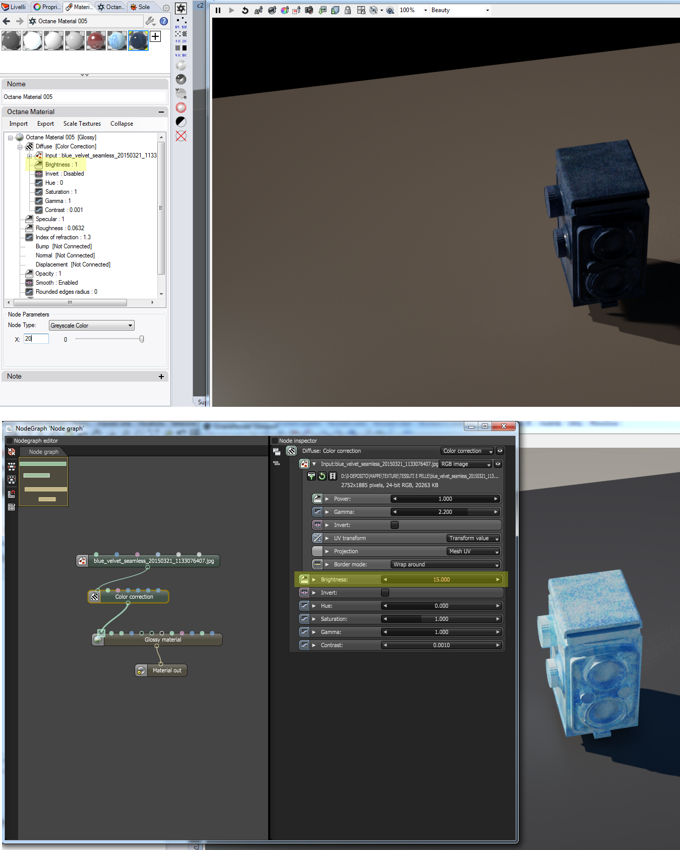 Same thing for bump, normal and every slide that in Octane start from maximum value (1)