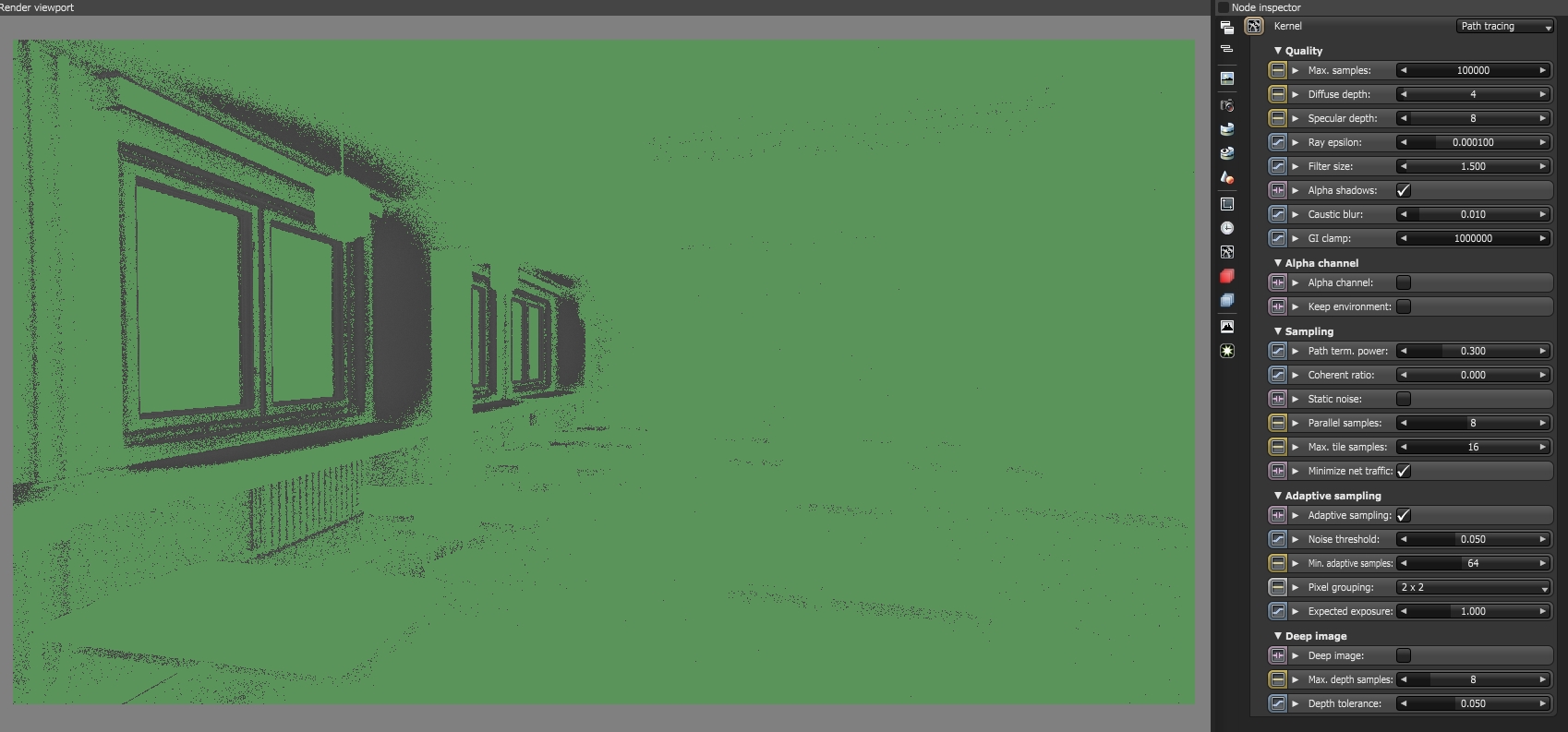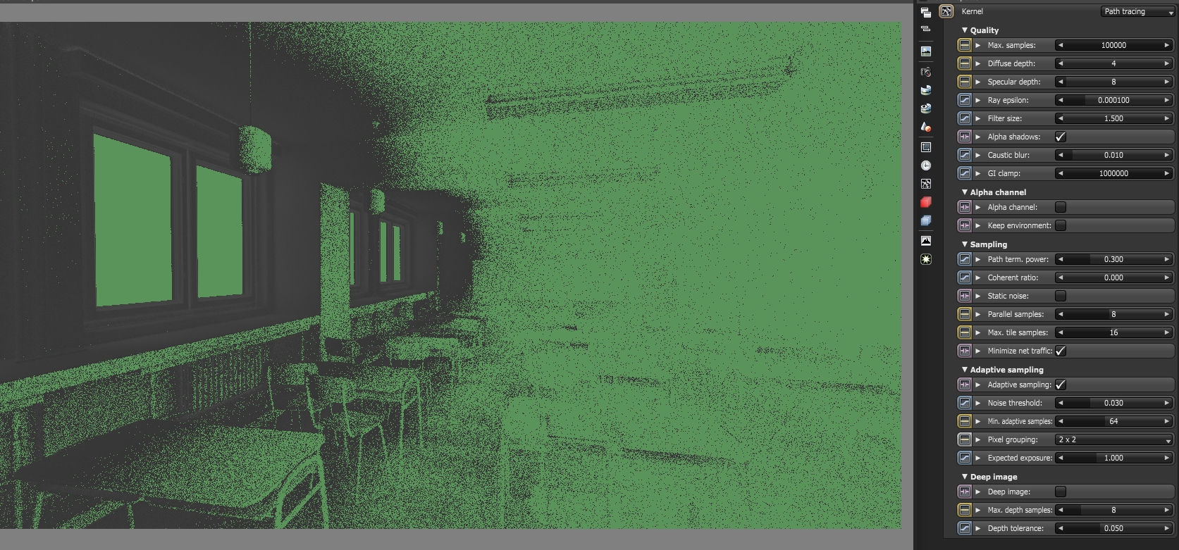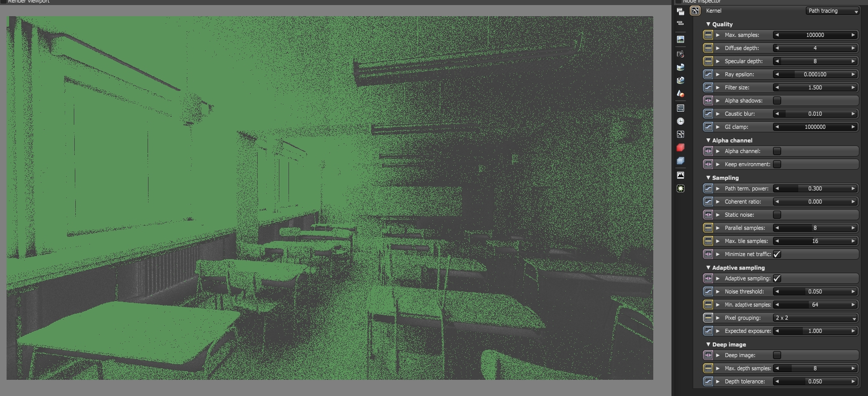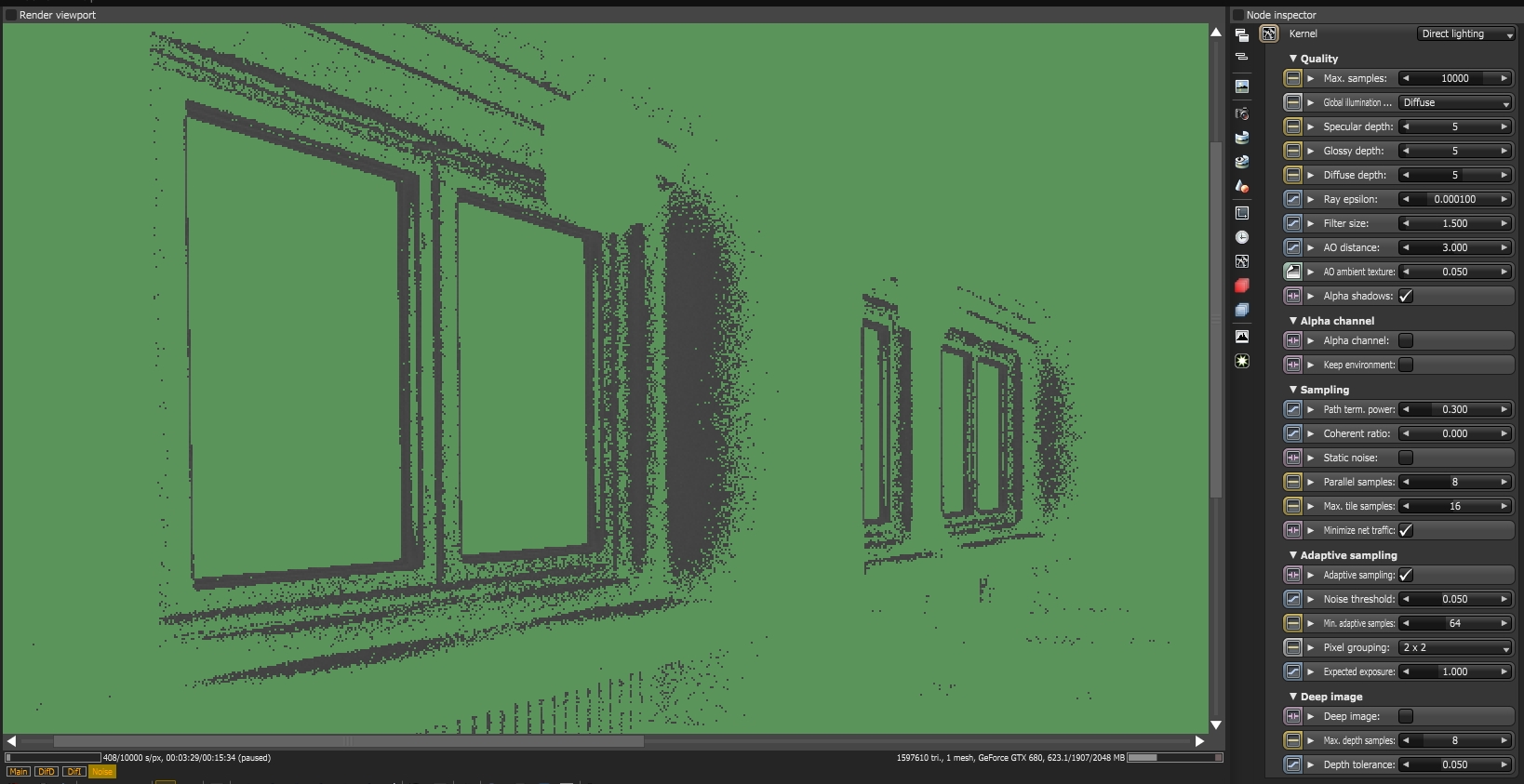 - Almost same noise map of the 0.030 threshold but 10000 samples twice the render time has not affected much