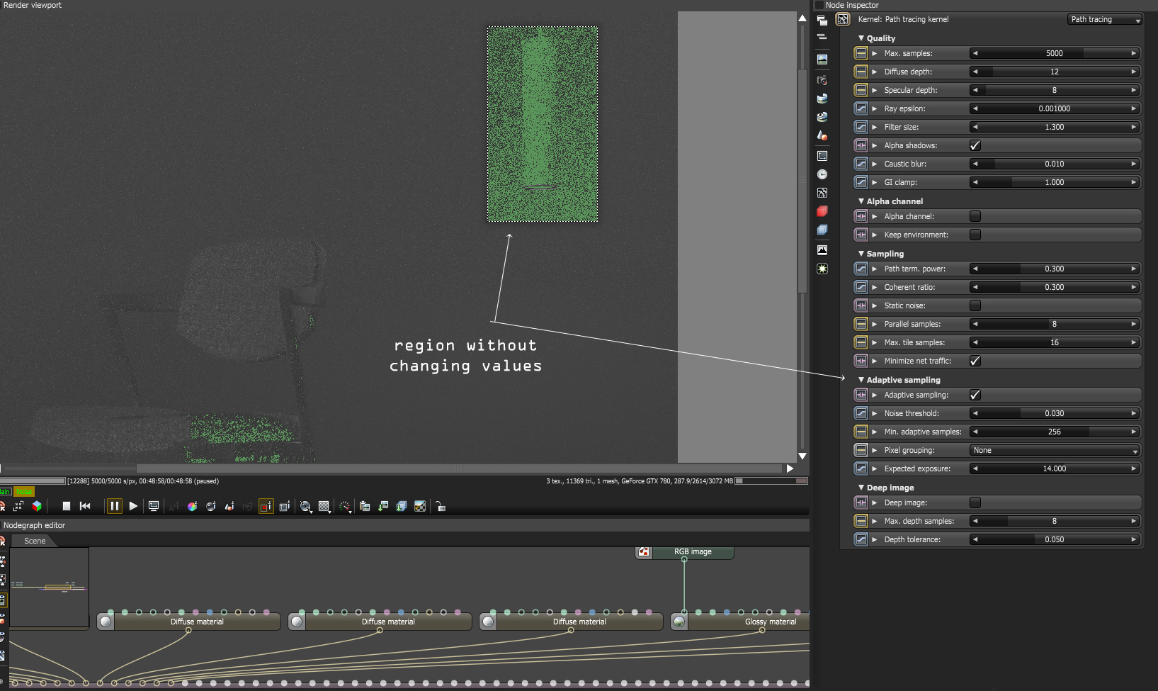 Then without changing the Threshold leaving it at 0.030 I used the Region Render and just after kind of 7 minutes I got so much noise cleared out and wondering why it hasn't detected in the first place not even a bit, region render obviously takes all the power need to quick render up but no noise is detected at 0.010 or should I increase samples at 10000 .. I though that it could kick in and start clear fast..instead I'm curious to get things cleared out on the matter.
