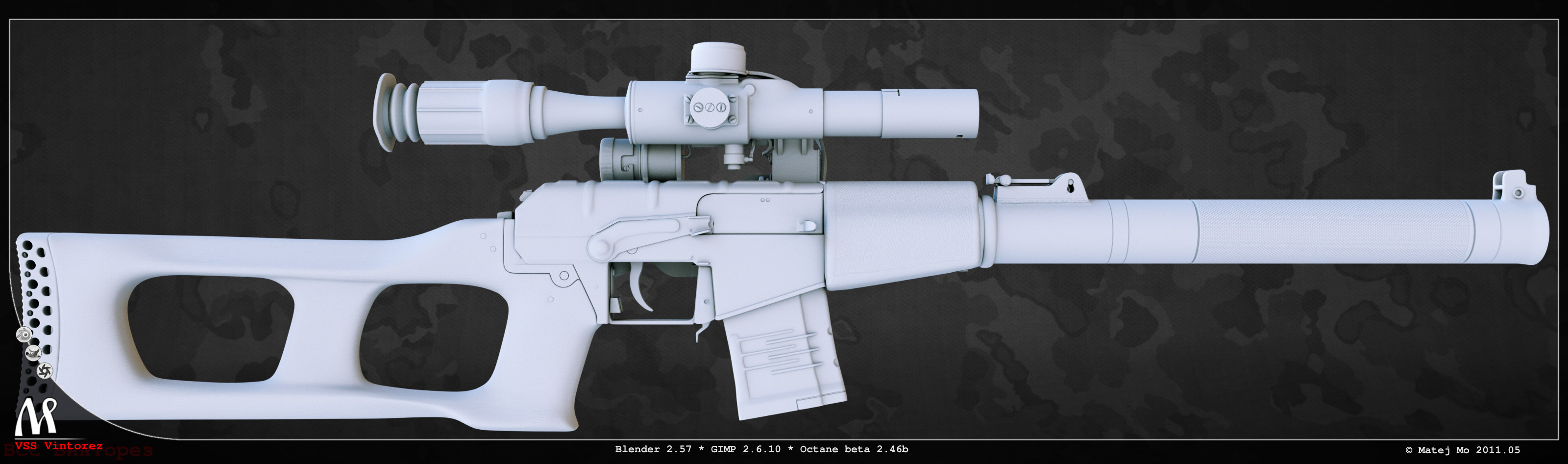 I find Vintorez a very interesting exotic design (I like the buttstock and big integral silencer). With the scope attached it looks less ugly than without. The next thing will probably be the AS Val, because I will be able to reuse most of the model. In the future I was already thinking of OC-14 or SVU (I obviously have a thing for ugly-looking Russian firearms). The M14 EBR looks nice & 'techy', but I think it would be a big modelling challenge (but there are probably a lot more reference images and drawings around)...