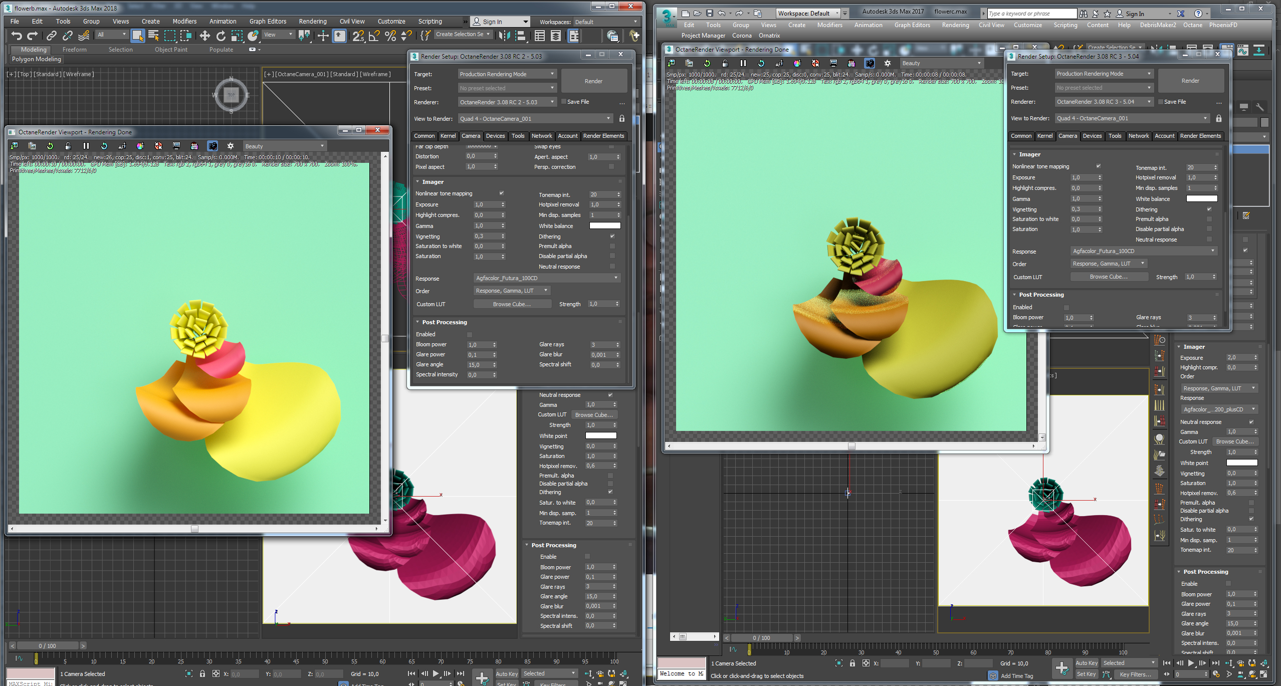 2) v3.08 RC3 - 5.04 - light and colors wrong, render has some artifacts.