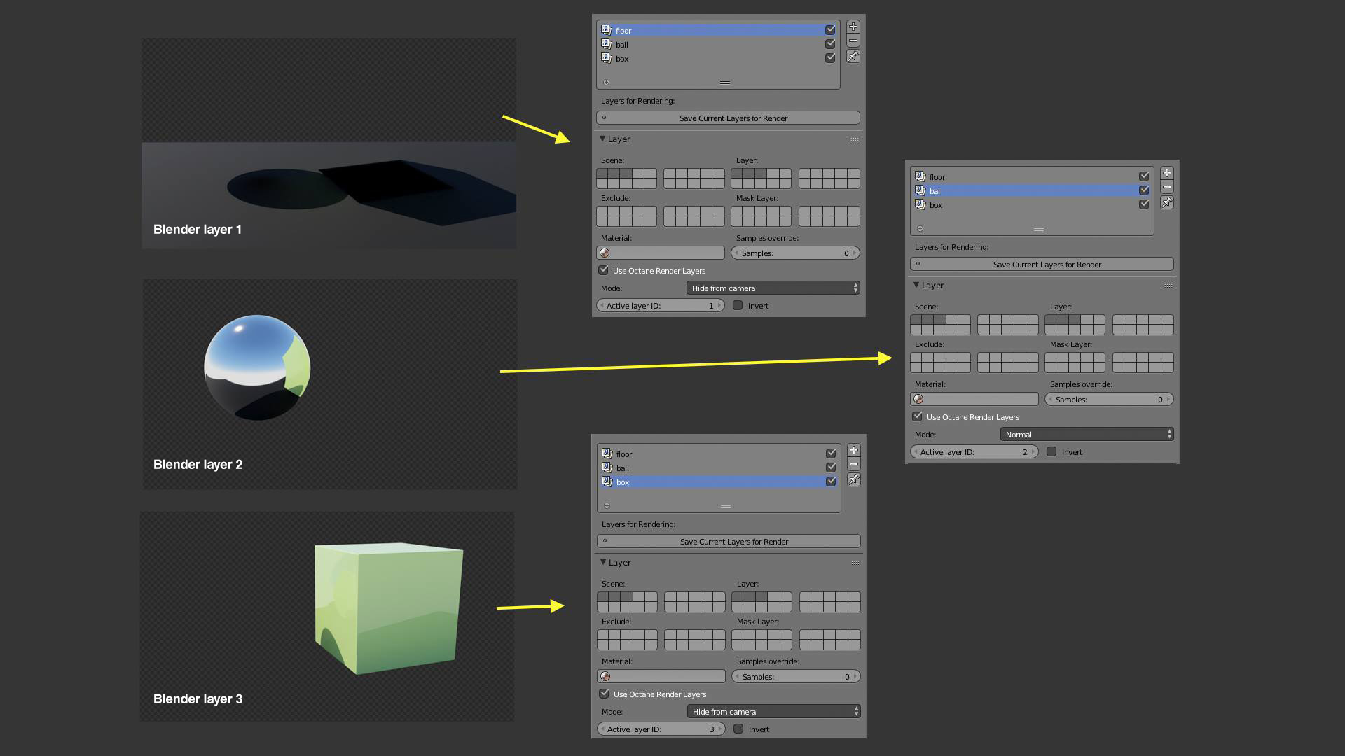 It's still really confusing. How do I now get shadow passes in the same set up? What is the 'Octane render layers(Global)' tab for? Why when I select 'Hide from camera' on a layer, it hides the other layer? etc. etc.