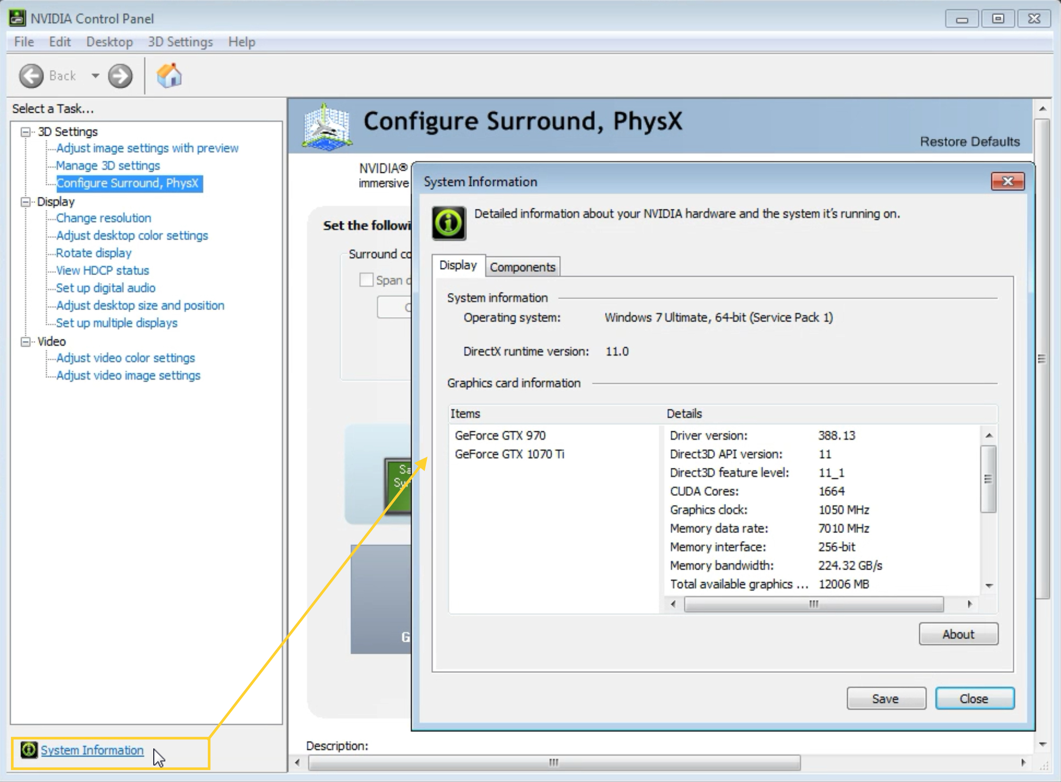 Please navigate to your Control Panel/Nvidia Control Panel, press the System Informations link, and share a screenshot like this.