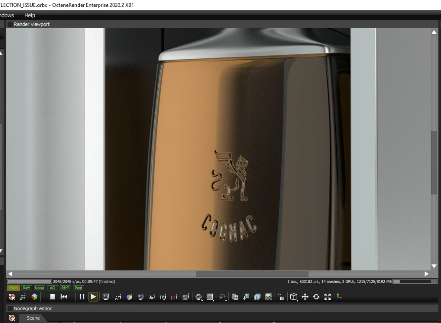 2. Your glass material needs a roughness value greater than 0. In these cases, I typically use 0.001 or similar. Mess around with that a bit to get the look you are after. The reason that you do this is that no human-made material is perfectly smooth. In fact, the only thing in your scene which should have a roughness value of 0.0 is the cognac, as only liquids can achieve true smoothness.