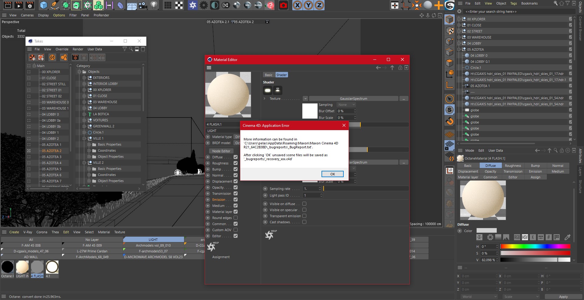 I am having issues, though, with the C4D take system: I don't think it is specifically related to the last Octane build: Sometimes changing one simple parameter from any element makes C4D crash - e.g. changing emissor's power.