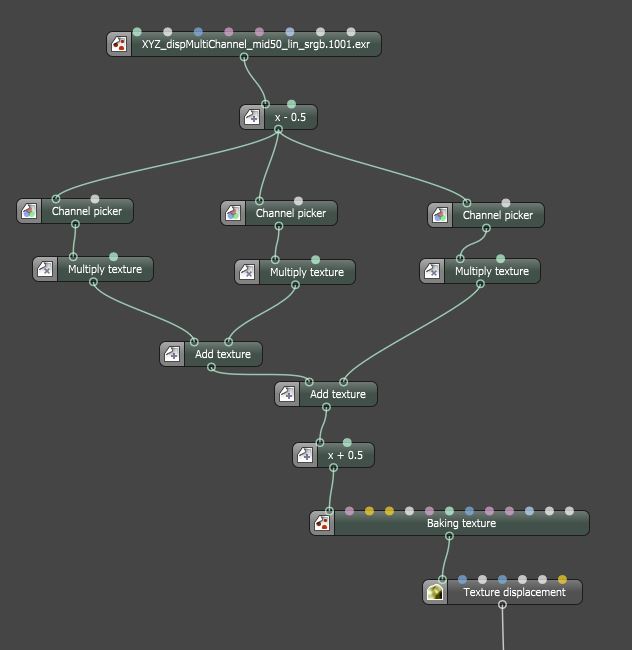 The way the mid level of 0.5 is handled in our case is by setting the Mid level displacement field in the Texture displacement node to 0.5.