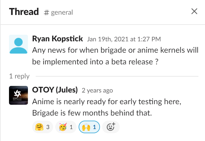 Not much point asking about ETA - refer attached imageDingbat wrote:thanks for the updateGoldorak wrote: Anime edge kernel is in a pretty good state as a render delegate (which we can then sideload in Octane core), but like polarization and some other roadmap features, I have put them further out because users have strongly voted on us shipping more urgent features ahead of this (including PPM caustics). You can do amazing things with the current toons shader, and the edges rendering is going to make that better. Right now, we have our work cut out for us on real time, meshlets and a long list of user requests that is the lifeblood of us supporting a very broad userbase.