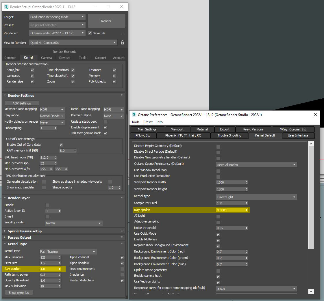 Ray epsilon values in Octane Preferences and in Render Setup are different.