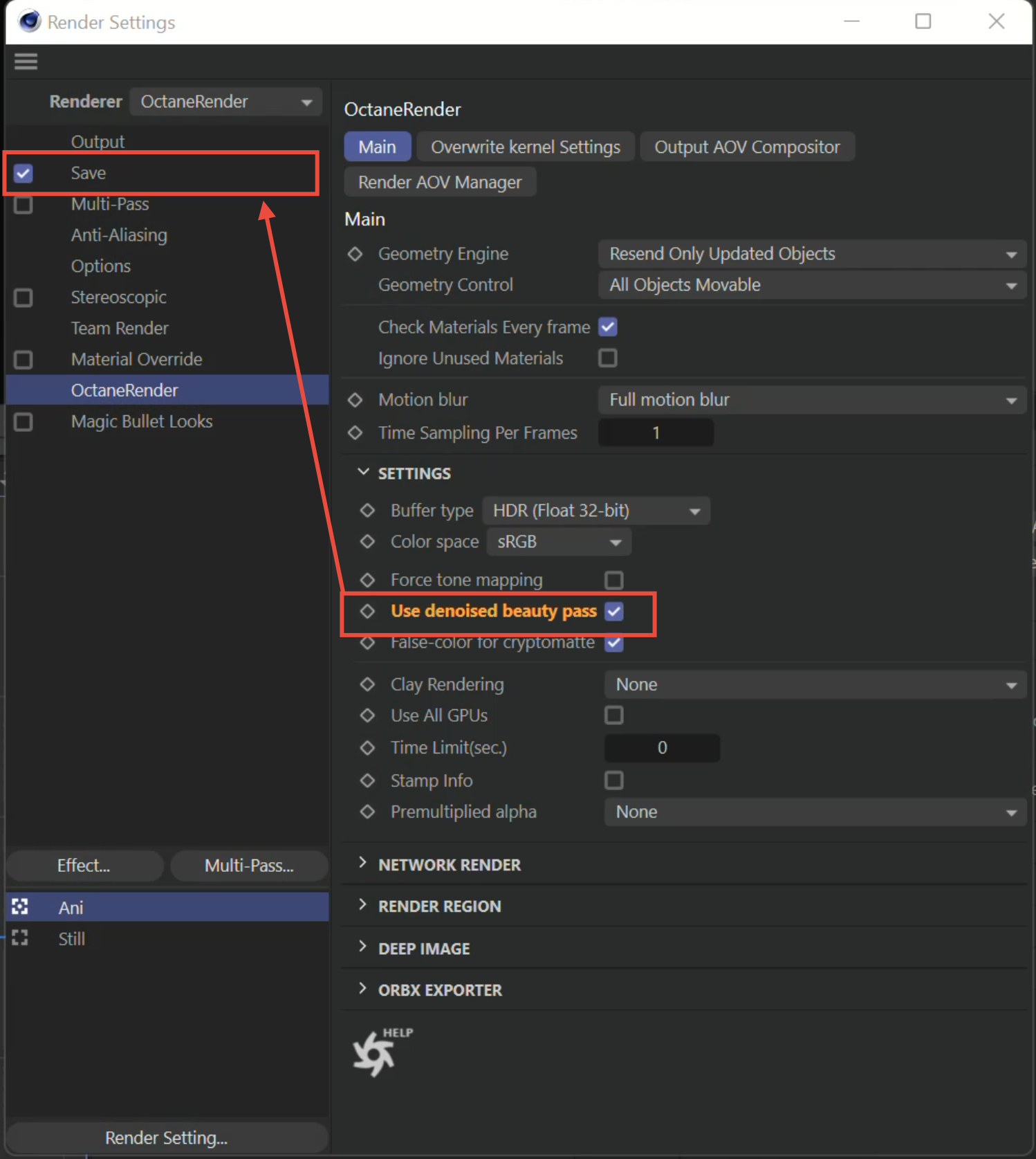 What is not working is the "Use denoised beauty pass" option in Render Settings/OctaneRender/Main tab, if you save your results via C4D Save option: