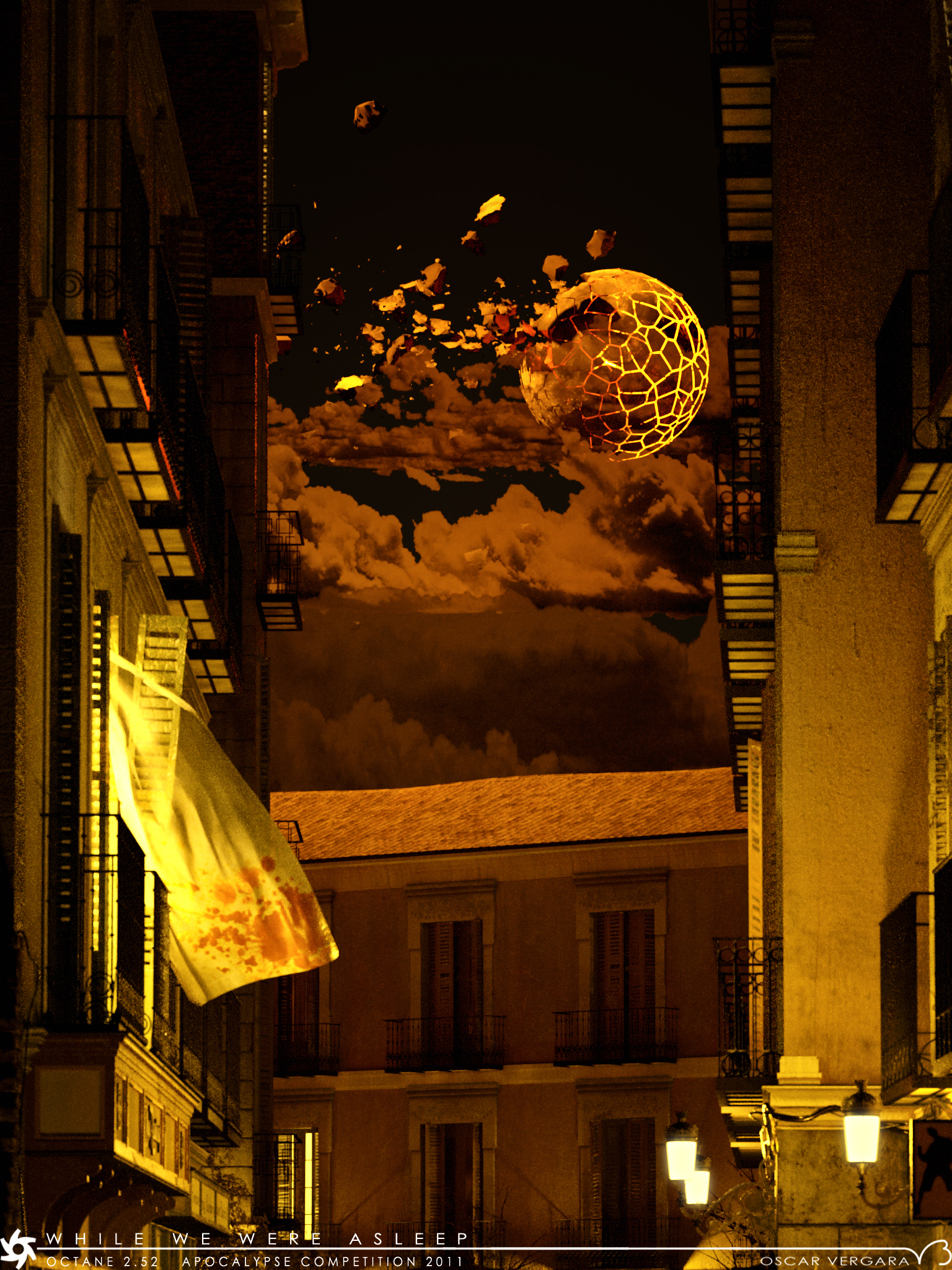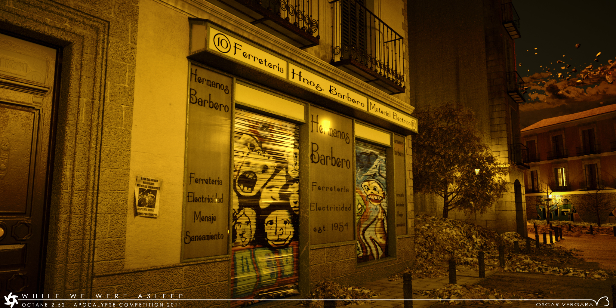 You can see a more detail explanation on the wip thread, basically the whole street modeled in SU, debris and sculpture in sculptris, moon and curtain in max, and all mixed and exported from max. Tree, and props inside the shop are from googleware house, textures either hand painted, from my personal photos from some real jobs in buildings in that area or at least the same tipology, and heavily modified downloaded from cgtextures.