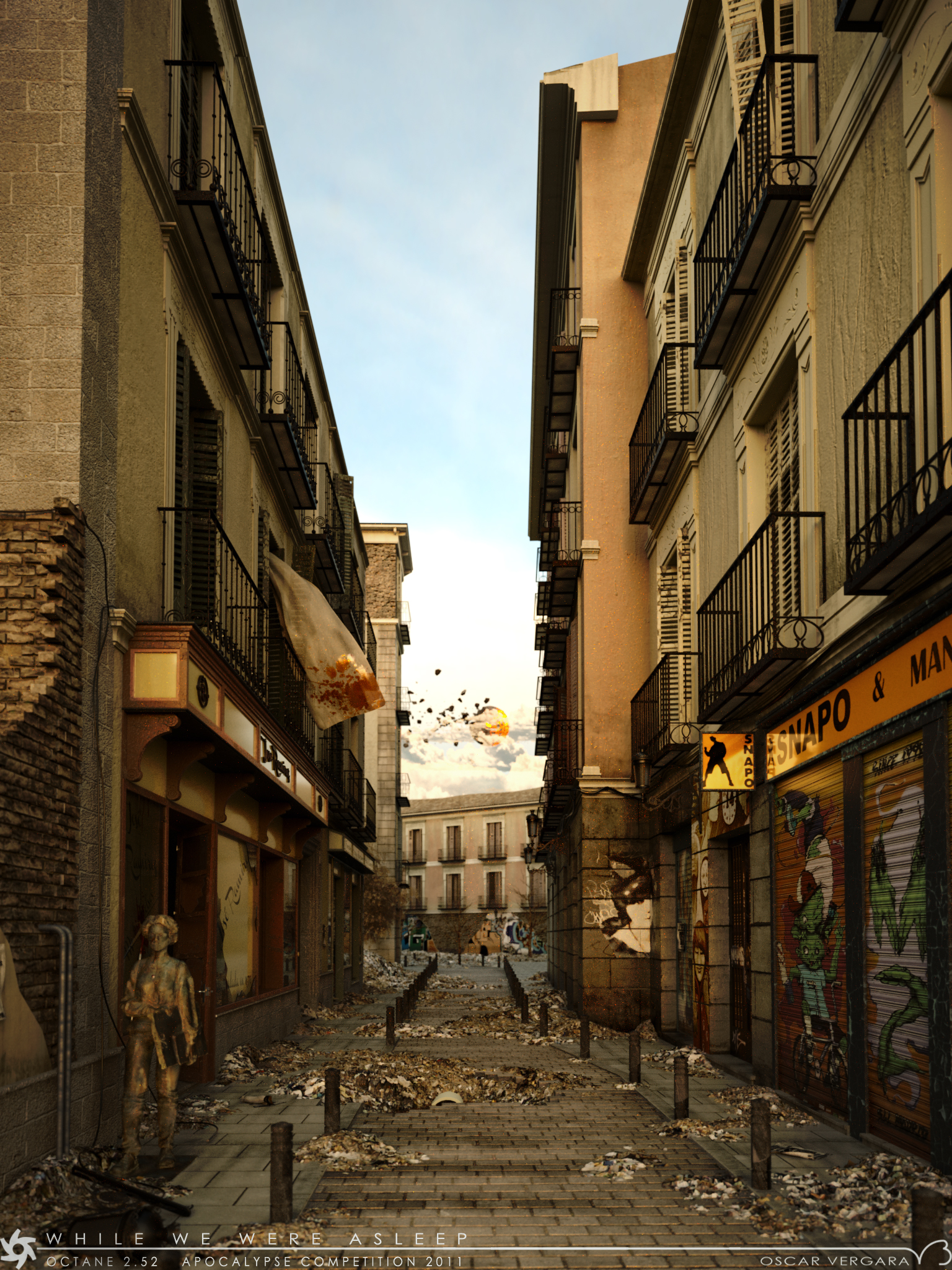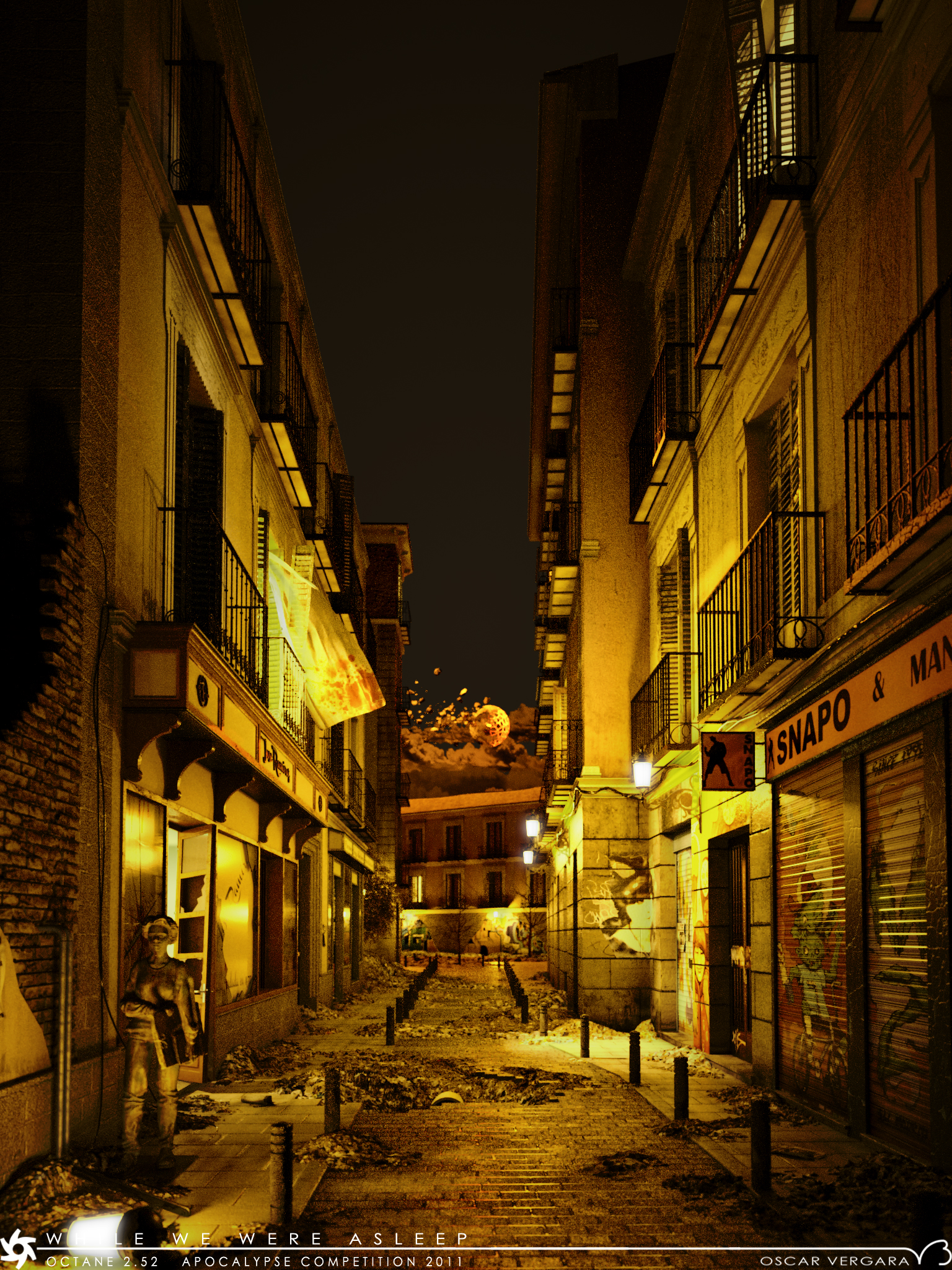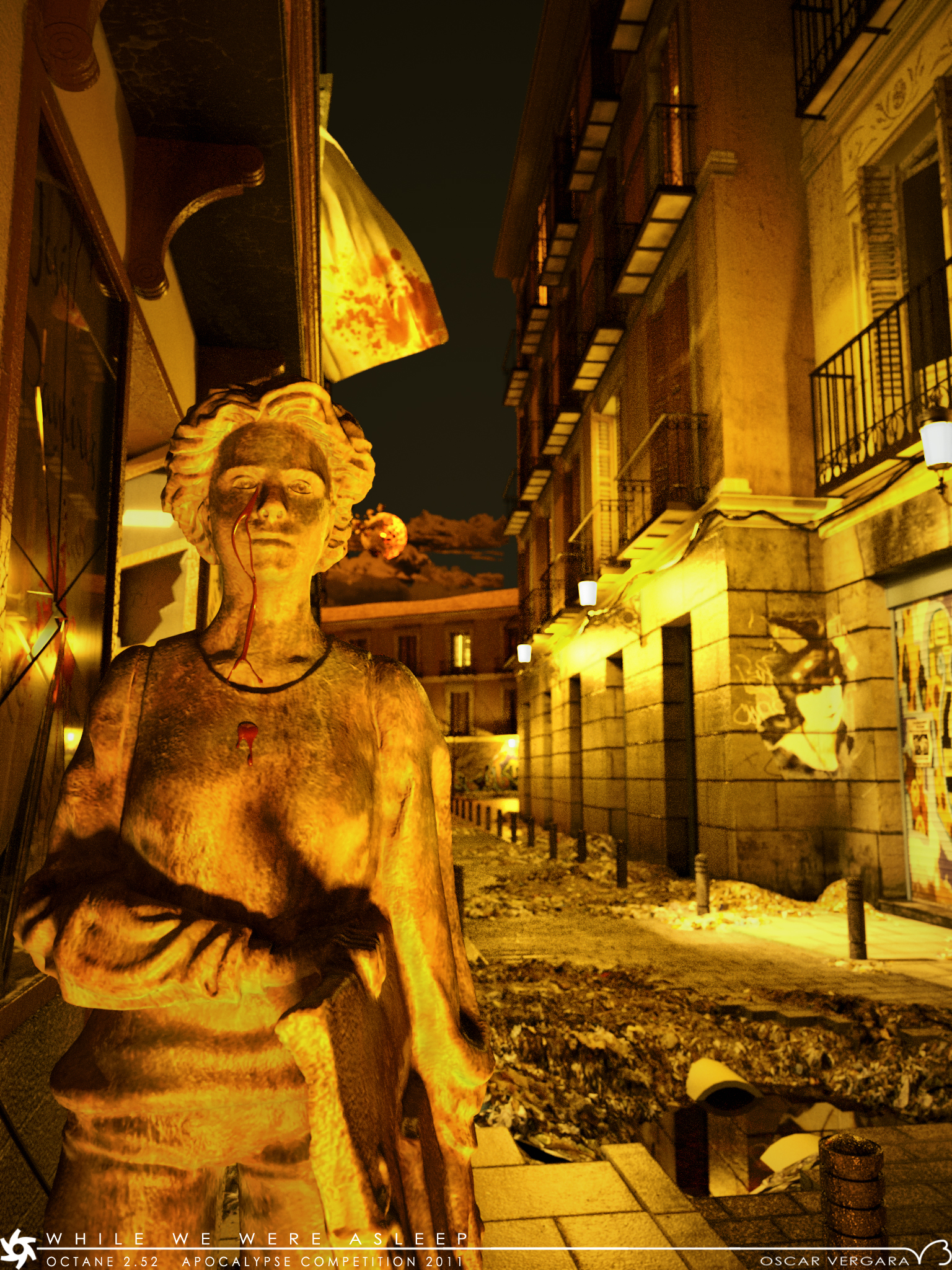 I was thinking who would cry for us if the apocalypse came and took us all. I wanted to depict a street a little after an apocalypse, where it wasn't clear if we were all dead or just fled the city and where the only witnesses left were the sculptures we left behind and the architecture, as mute survivors. I wanted to leave some clues of what had happend (the exploding moon, blood in some places, the "crying" sculpture) yet not give a clear sign. I pick a street on a district I love in Madrid (Malasaña) and did some mixing with different places in that district, all you see you can find it there, including the student sculpture (there are several on that series, althou this one has my girls face instead of the original one as explained in the wip)