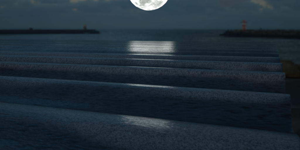 Test scene done in five minutes, just a simple plane with a noise and wave modifier, added a sphere for the moon and used enviroment HDRI for lightning. Rendered with PT.