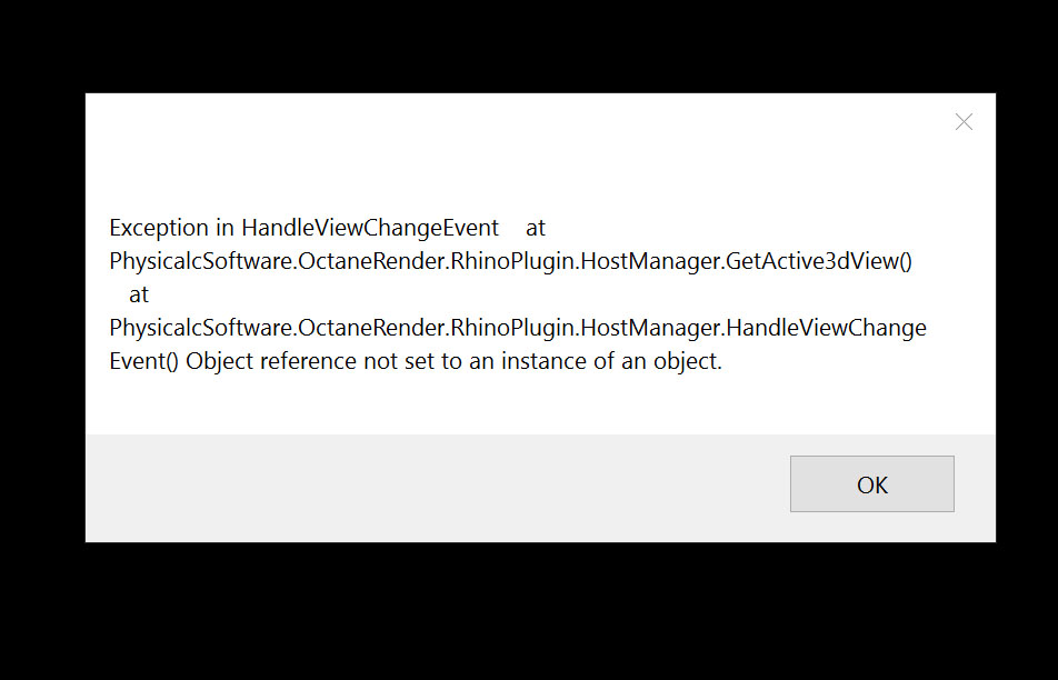 Which Rhino 6 build are you using pls?More information. I loaded Octane for R6 again and it worked fine the first time. The next time I opened R6 it would not run and I got the 'exception' message again ... attached.