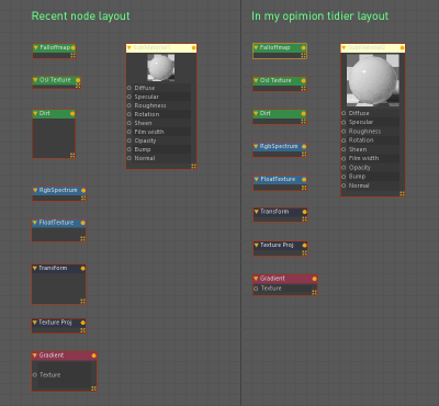 As I do a lot of work for clients that later take my shaders and work with them I am concerned about a clean tidy layout. So I usually spend some time with some of the nodes reshaping them to a uniform size.