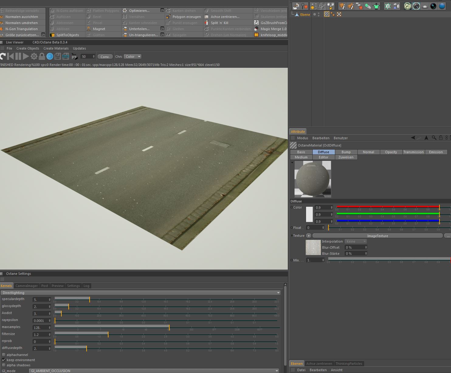In this case I first added a plane and a diffuse mat with a road-bitmap (tex_1).