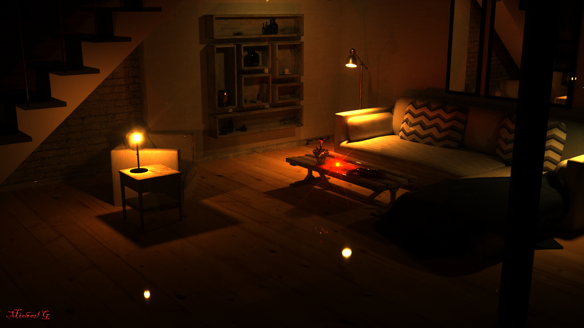 What started out as sun/sky render turned into a warm night time render instead, 5 light mesh spheres with varying wattage (3x60, 1x40 and 1x25), small amount of bloom and glare.
