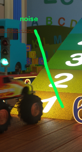 this is what image looks like AO after 3200 samples 720P. Monster truck has two plain disk lights in front. Also number blocks have object emitter lights (glowing diffuse number texture). Seems like when one light shines at another it is impossible to render noise free. We used 12 X 780Ti It took 2 minutes to get 3200 samples. And we do animation so we need 30 frames per second. Hopefully V3 octane will improve noise at night especially when one light shines at another because to make it noise free it would take same mount of time as CPU. Why cannot octane lights be as fast as octane daylight system. At least fake option for animations (like quick 3ds max standard spot light) - light just shines and makes some parts brighter like daylight system (plain spot light with GI or no GI option) ,