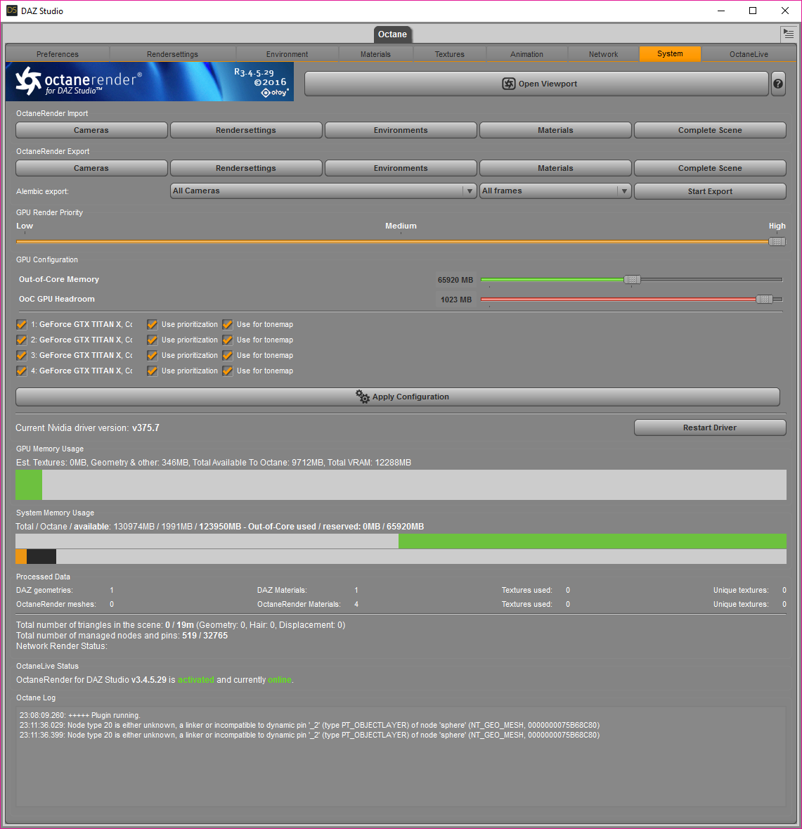 4. Immediately you should see the error in the Systems Tab and the Octane Viewport will have the running orange bar.