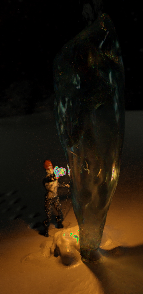 well, here is my failed experiment, not only from sucessful ones we learn ;) . This is my alien shore scene. I wanted to add disspersion values to the ice blocks. Since there is 2 builts in between I had to upped the eficency for the moon and the hand held "torch", that was expected, what was not is that yet with those values even in PT (in which was originaly rendered) couldn't achieve the same exposure, I was getting almost dark shot in PT, so I upped the power of both lights almst to ridiculus values 6000 and 1500 each, but the surprise came when I saw that in PMC, it was totally overexposed giving that blue noise problem, if I rised the fstop to 60 it looked "ok" yet if I lowered the power of the lights I would get no shadows at all. Also, quite curious, the lamp in the alien's hand was changing colors all the time, from cyan to red to several other hues in PMC. See for yourself, any ideas anyone?