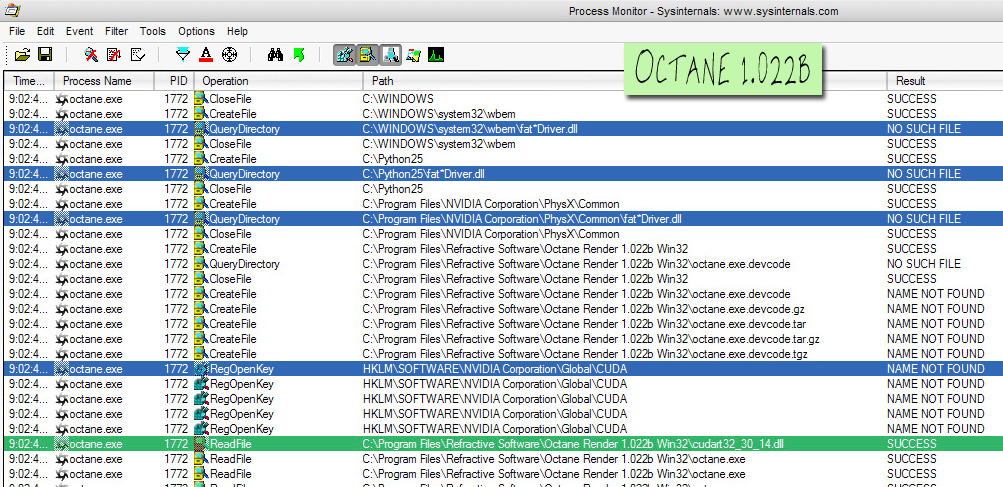 I Use the standard Blender cube and export it to "D:\". Click on add mesh, then select cube.obj. Sometimes the rendering will begin and sometimes not. On a lot of the crashes, octane was looking through all the environment variables for a file "fat*Driver.dll". See the following dump from Sysinternal process monitor at the time of crash.