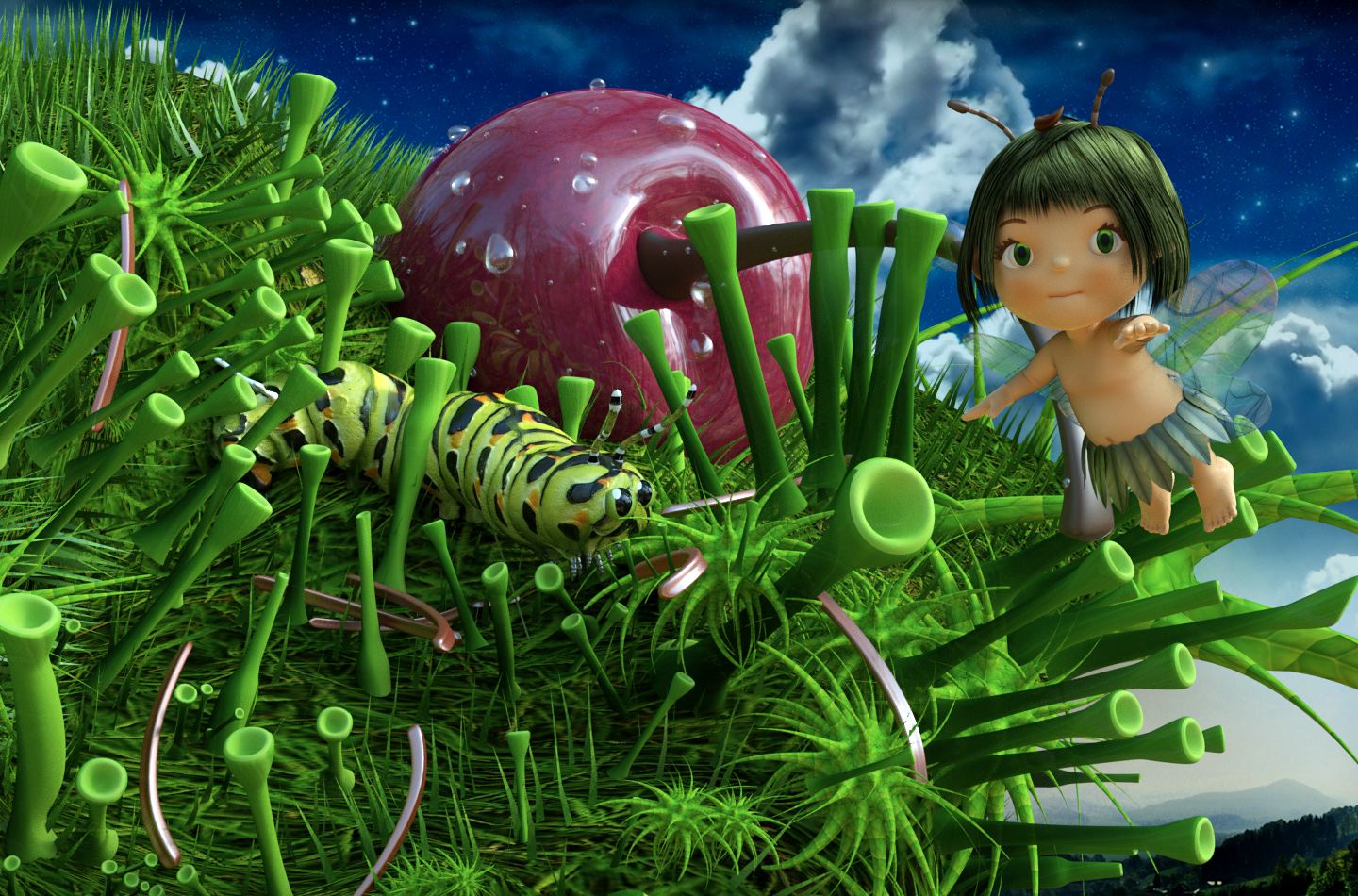 I think you still have to work some more on the "trumpet-shaped grass/flowers" (bevel them some more, they are not smooth)