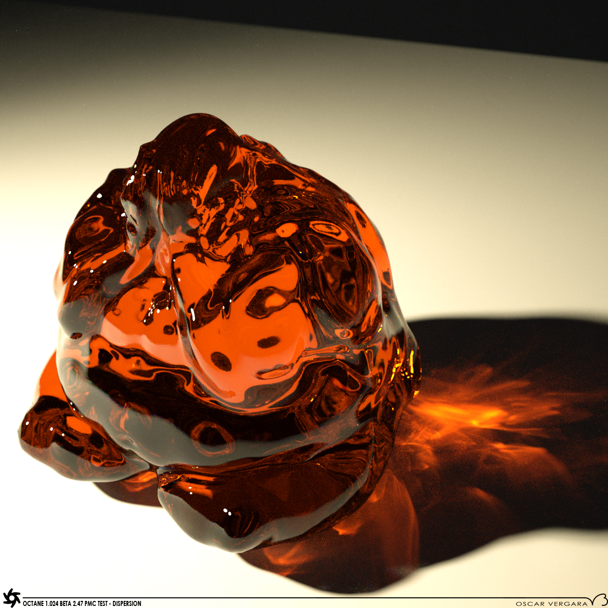 Well, meanwhile I remembered a little statue I first modeled when I met sculptris, and I thought it would do for a nice dispersion test. Just my "fat thinker" with a specular full reflection with red transmision IOR 1.45 and 0,025 dispersion, a base plane with a diffuse white material, and a "home made" projector for a focused light.