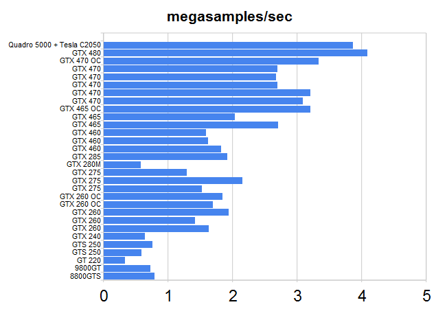 Something is wrong with the quadro 5000 + tesla c2050, their result should be twice the 480 one!