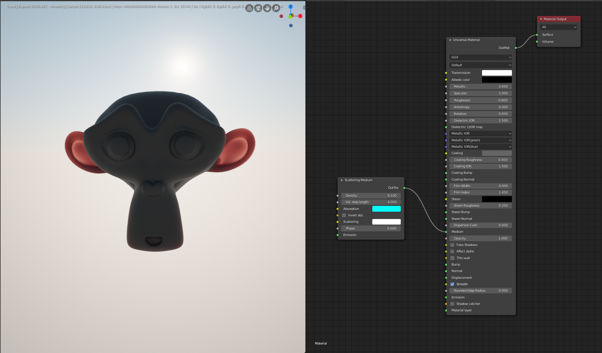 Normally I should be able to use a Universal shader node and a scatter Medium node to get Subsurface scattering in the path tracer or PMC. but the Medium Node has no effect. Maybe I am just doing something wrong but I tried out a lot and nothing seems to work.