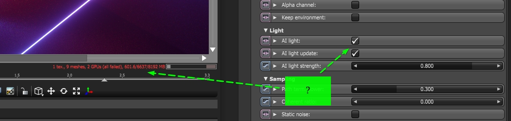 When I load scene, AI light not activated. I Change "No node" to default and check AI light and Octane stop render and I get GPU all failed. What am I doing wrong?