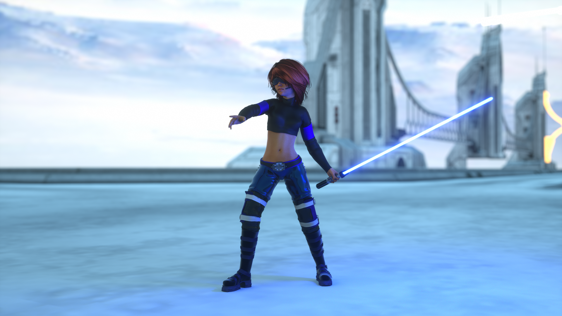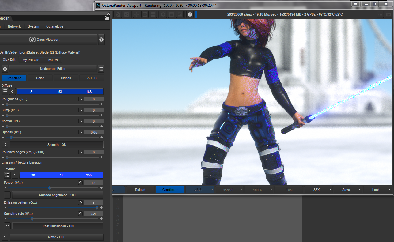 Oh, the whole point of the experiment was to attempt to get a lightsaber effect without post-work, so there is none on any of this, it's all straight from Daz and OcDS. Not that I dislike Photoshop, I was just curious how well Octane could manage unrealistic things, and it surprised me. Granted, Direct Lighting is technically biased, I still could not reproduce the effect in 3delight (despite trying for a few years).