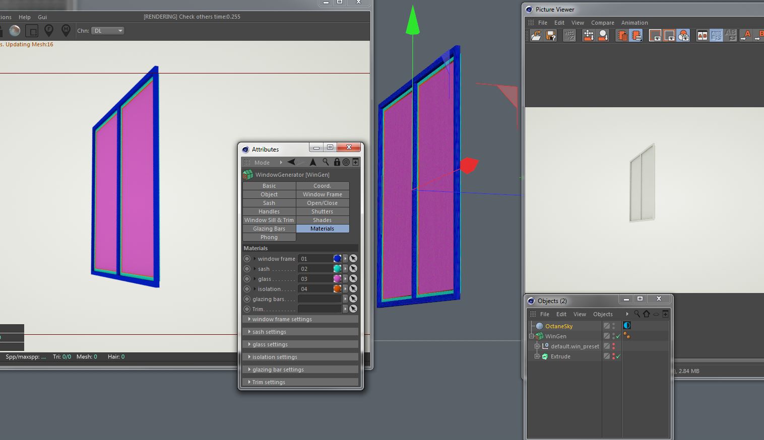 when i add a nullobject to the scene with all materials of the wingen object, the wingenobject renders with materials in the pictureviewer.