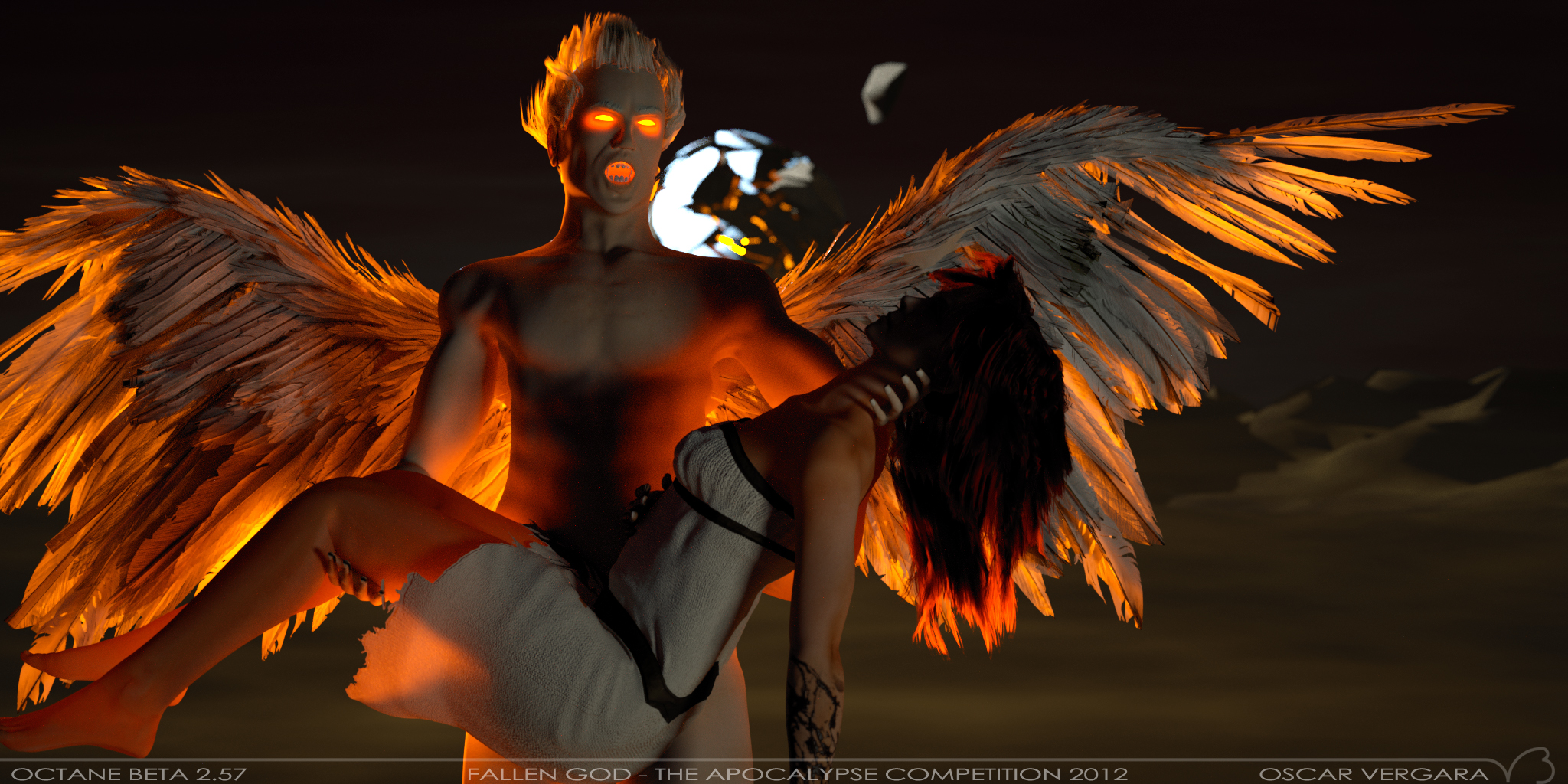The whole angel and the background is done in blender, the girl was from my previous entry. As a background there is only a rgb color (which was one of the things I was trying to achieve, a nice background using no pictures), the moon from my previous entry, some simple mountains and a plane with sss on a specular material and turbulence to create the "clouds". Everything is model from scratch using blender (and tons of tutorials). Hair and wing's feathers are particle hairs with polygons instanced on them, the feather is modeled but rather simplistic. The rig for the wings is simple too, I'm planning on improving it and might try to do a short animation with it someday (whenever I have that rare spare moment).