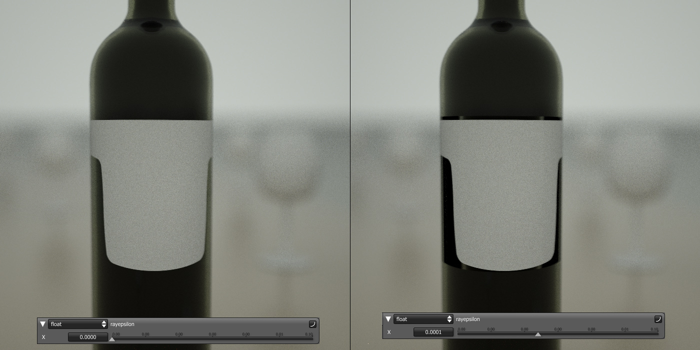 On picture below is a bottle with shaped label. The label si maped on tubus with bitmap controled transparency. If is rayepsilion 0,0000 it works good, if is 0,0001 the material unedr tubus has no samples on large area. Or if you have doublesided glass, you use hdri background and the rayepsilion is to higher, the view behind the glass is is wrong (scaled or shifted)