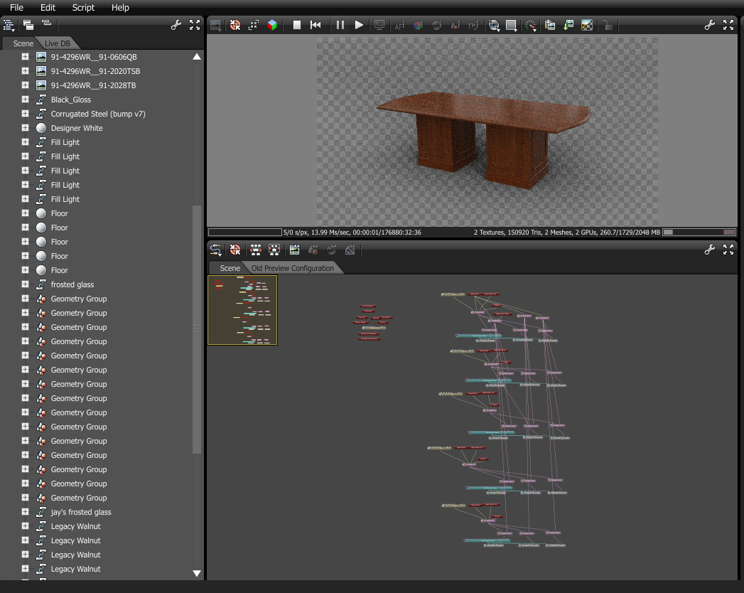 In my current project, we are rendering out conference tables. For this set, there is several different tops, but only 3 bases. I was able to export the bases separately and the rest of the scene by itself. Then quickly create geometry groups to add my 5 tops to the 3 bases. Setup my 15 render targets and now I can just let it go over night :)