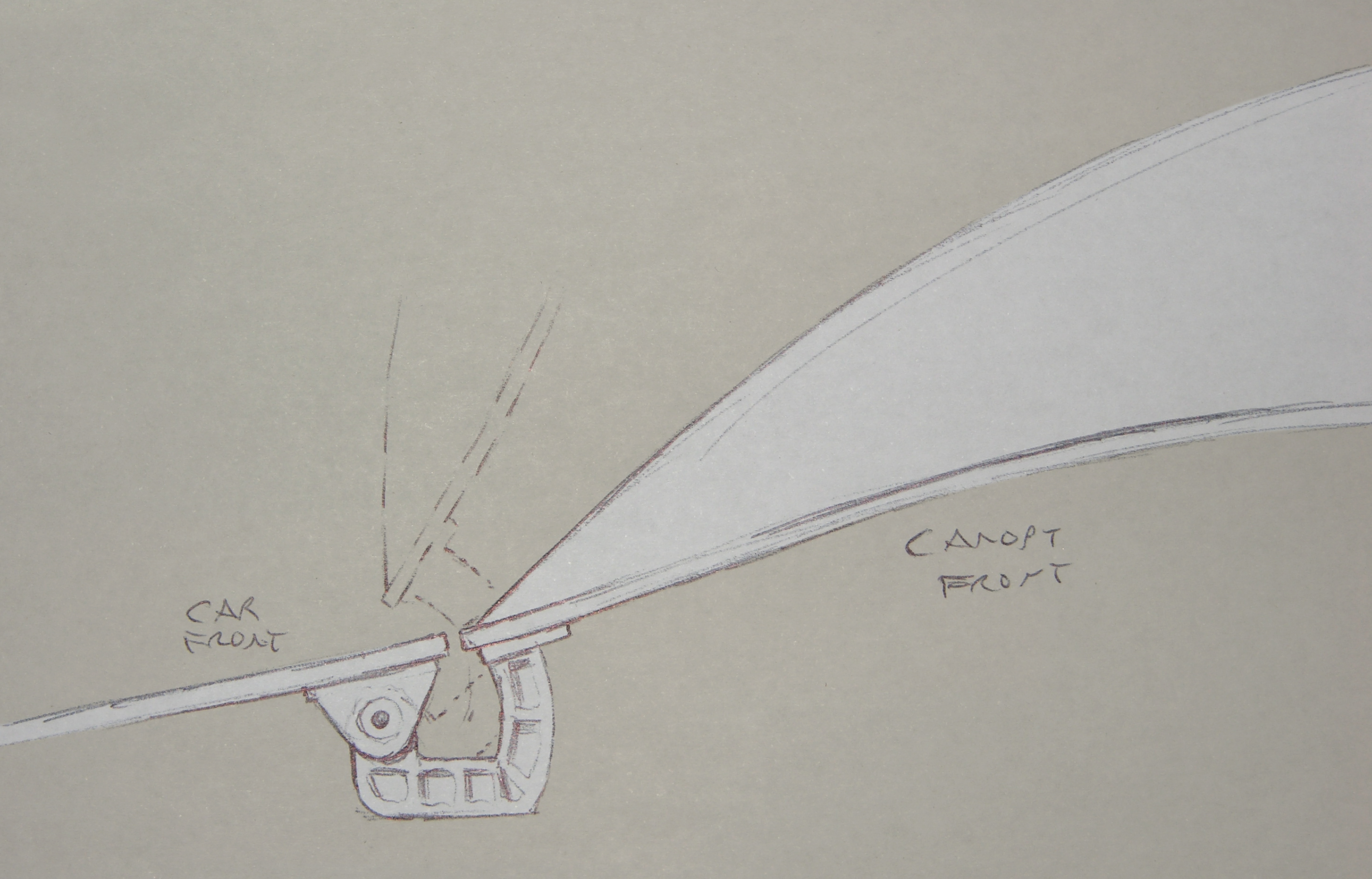 But if the canopy simply rotated upward, then the second motors would not be necessary. So then I thought, well, shoot, all I need then is basically a front hinge. So if I nix the idea of lifting the doors and canopy as one unit, then I COULD just hinge the canopy at the very front, with the mechanism hidden by a cover in the front of the dash that lifts up with the canopy.