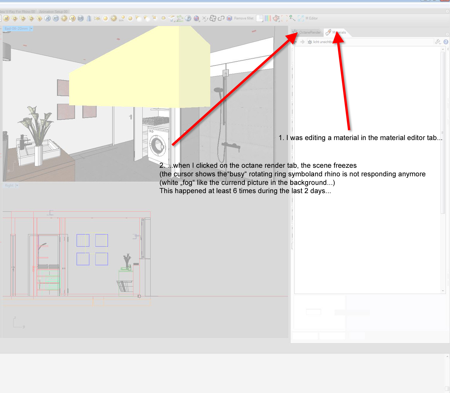 As shown in the attached picture, i recently run into rhino freezes when changing the tab from "material editor" to "octane"