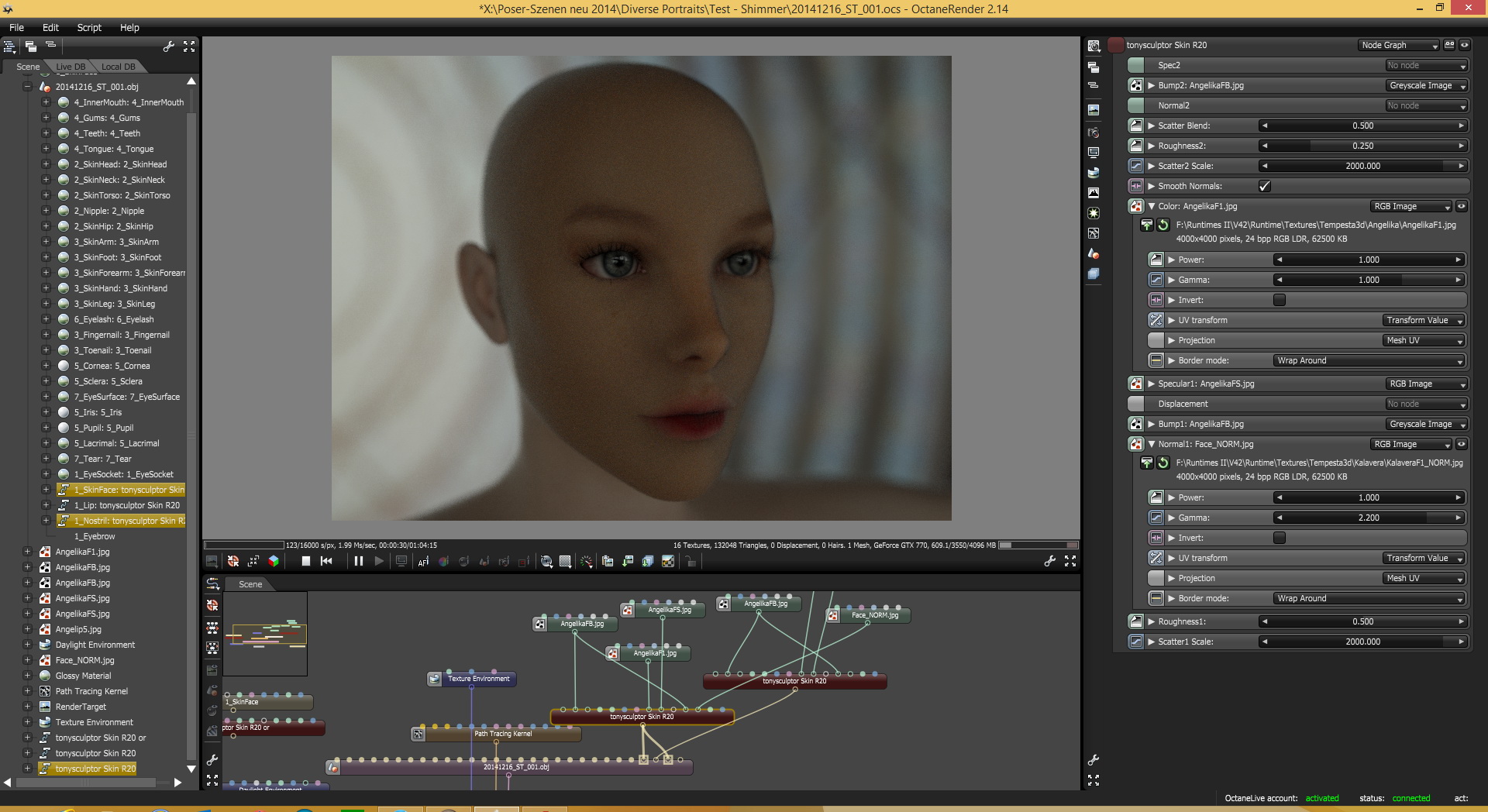 ...still didn't understand how to use that shader. I've exported a Poser-character as an OBJ-file and imported the mesh into Octane 2.06 (standalone), After that I plugged the texture file of the character into the "colour-slot" of the node and the "normal-map" (used "shader map" to create them) - but whenever I try to render the mesh I get horrible dark skin (path tracking mode) - so what do I have to do to get a natural looking skin using R20?