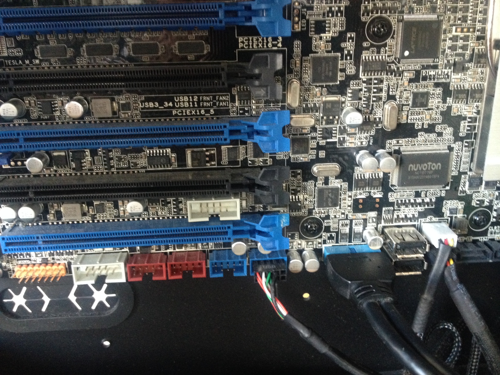 So I tried lowering the Titan one slot into the blue slot. But the Front USB 3.0 cable (wide one with the blue socket) was in the way. I tried bending it, but when I put the card in, it didn't fit and the cable sprung loose.