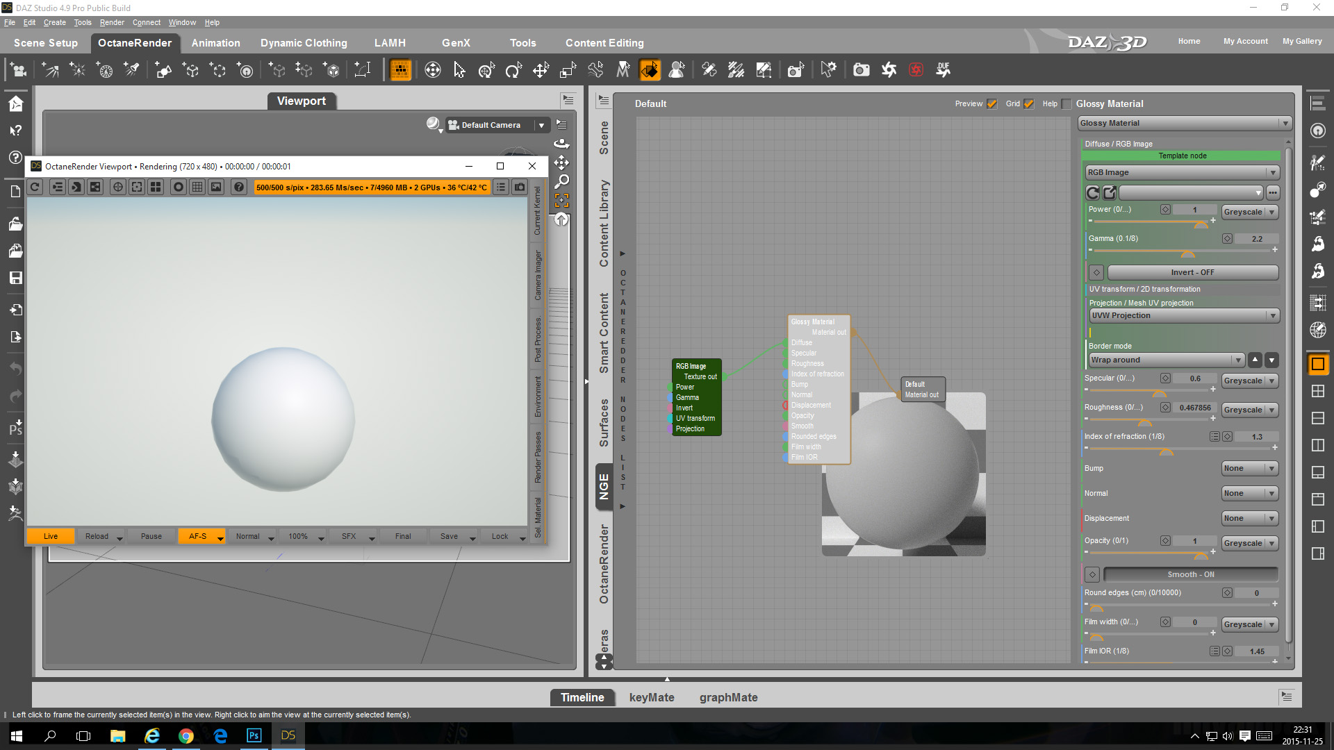 The big challenge is now to figure out which exact settings define the look of the metallic surface in Iray and how can that be translated into an OctaneRender "Glossy Material"?Side Note: