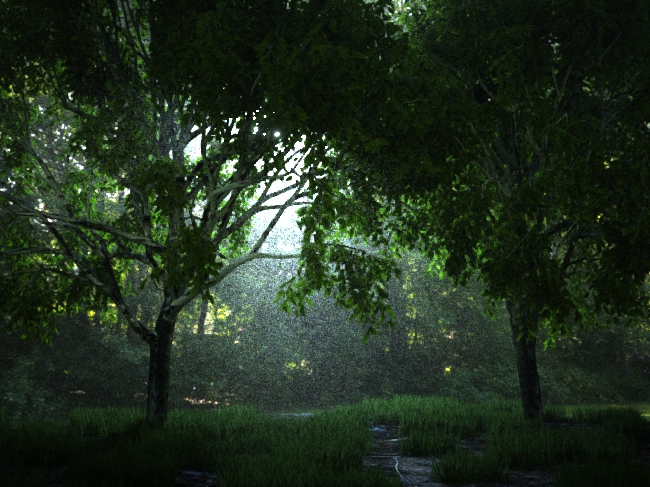 Here's my quick test with Juanjos scene. I dropped the density to 0.02. Tree leaves and grass have slight transmission setup, so that the light passes trough. On the ground I used displacement map to generate details, instanced some grass to it, from where the light can bounce like crazy and illuminate all the details.. Background is LDR image (as opposed to HDR), but it gives a nice tone to the scene.. I dropped the light power to just 5000. Imager node is set to "linear"..