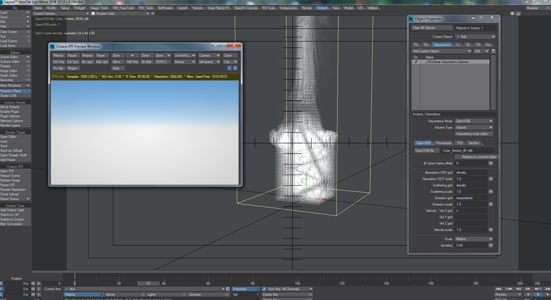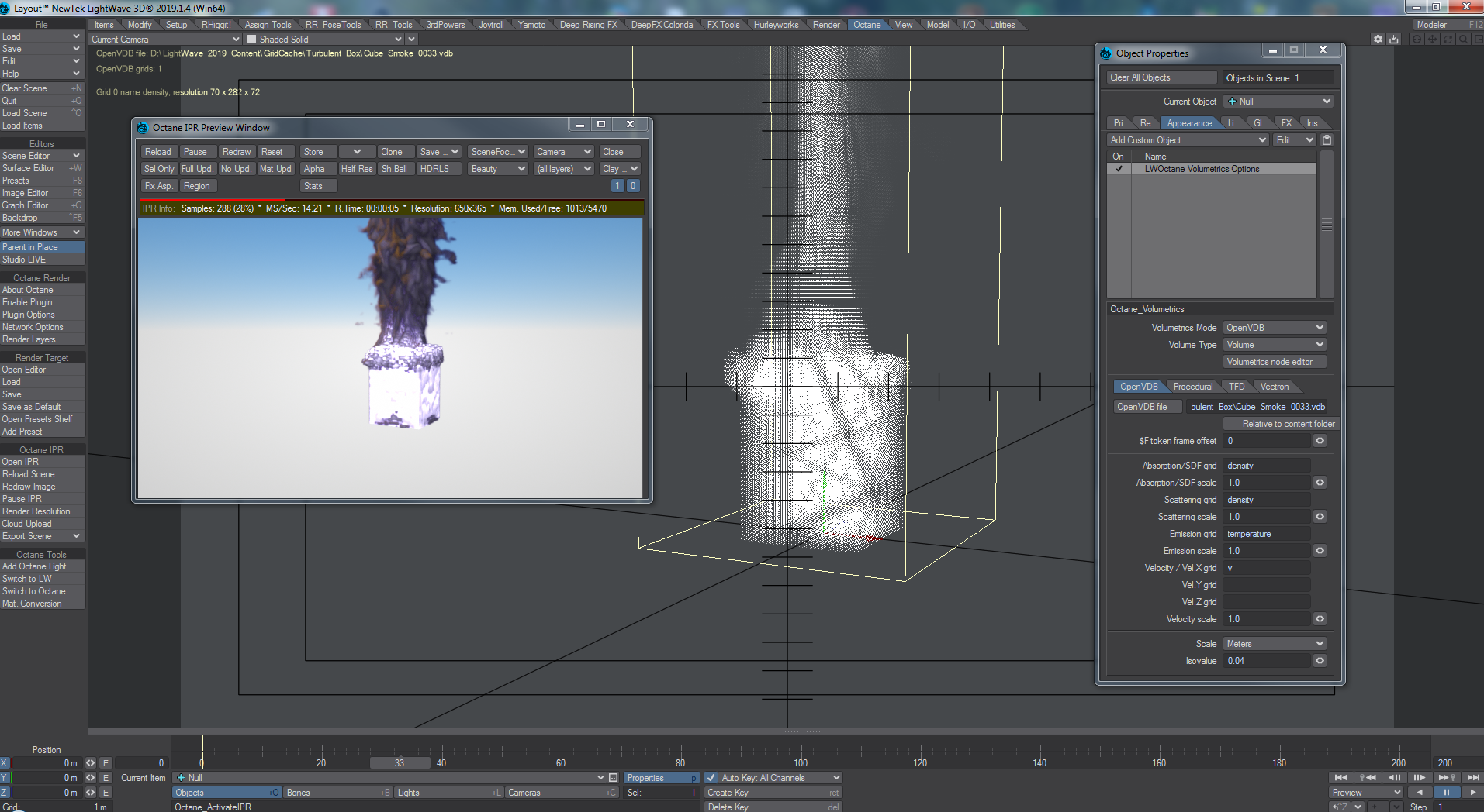 I made a sequence in LP based on the demoscene for LP2019. I saved the sequence and created a new scene. Added a Null object and assigned the Octane volumetric modifier to it. Additionally, I assigned a volumetric LV to the same object for visualization in the projection window of VDB files.
